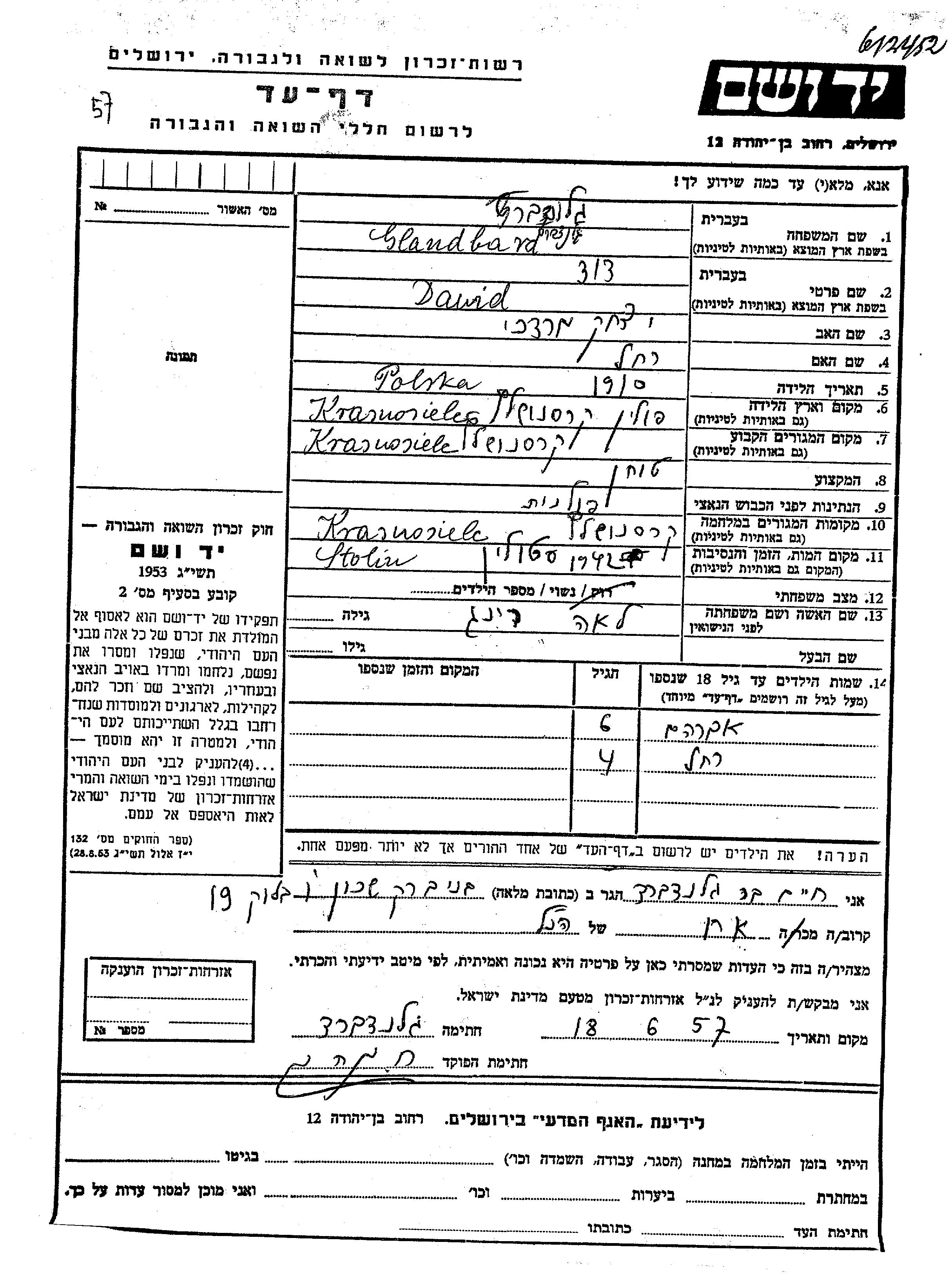 Glandbard Avraham Krasnosielc, Pologne Feuille de témoignage
