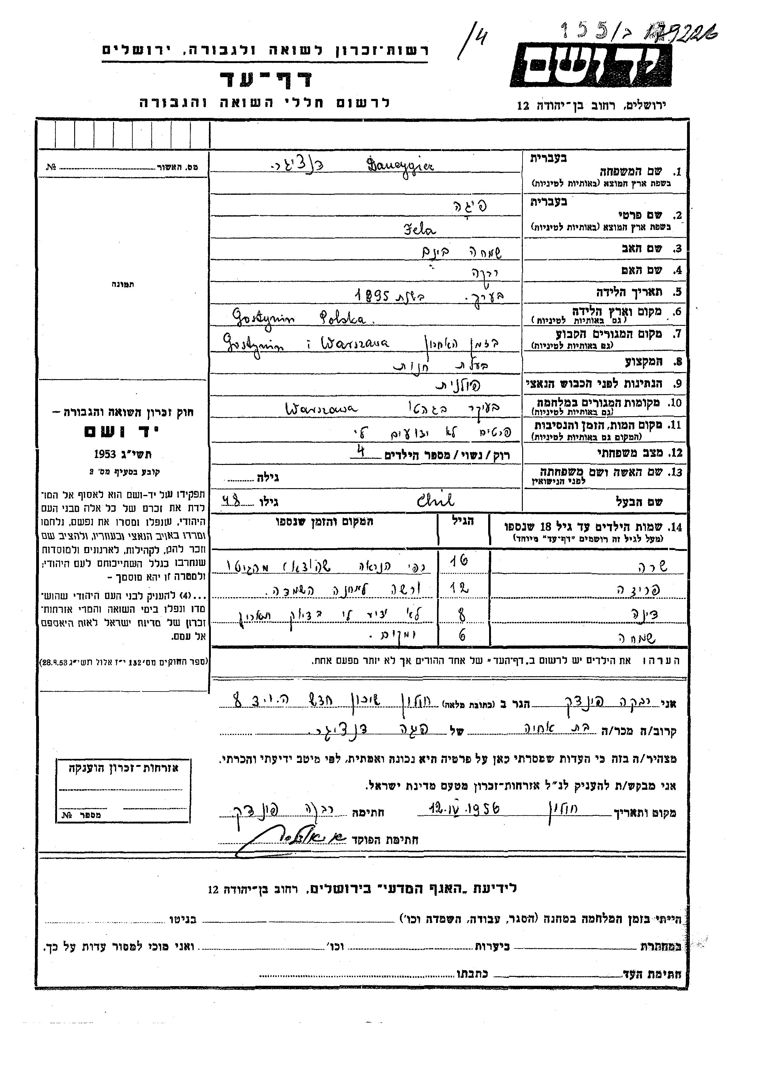 Dancygier Dina Gostynin, Pologne Feuille de témoignage