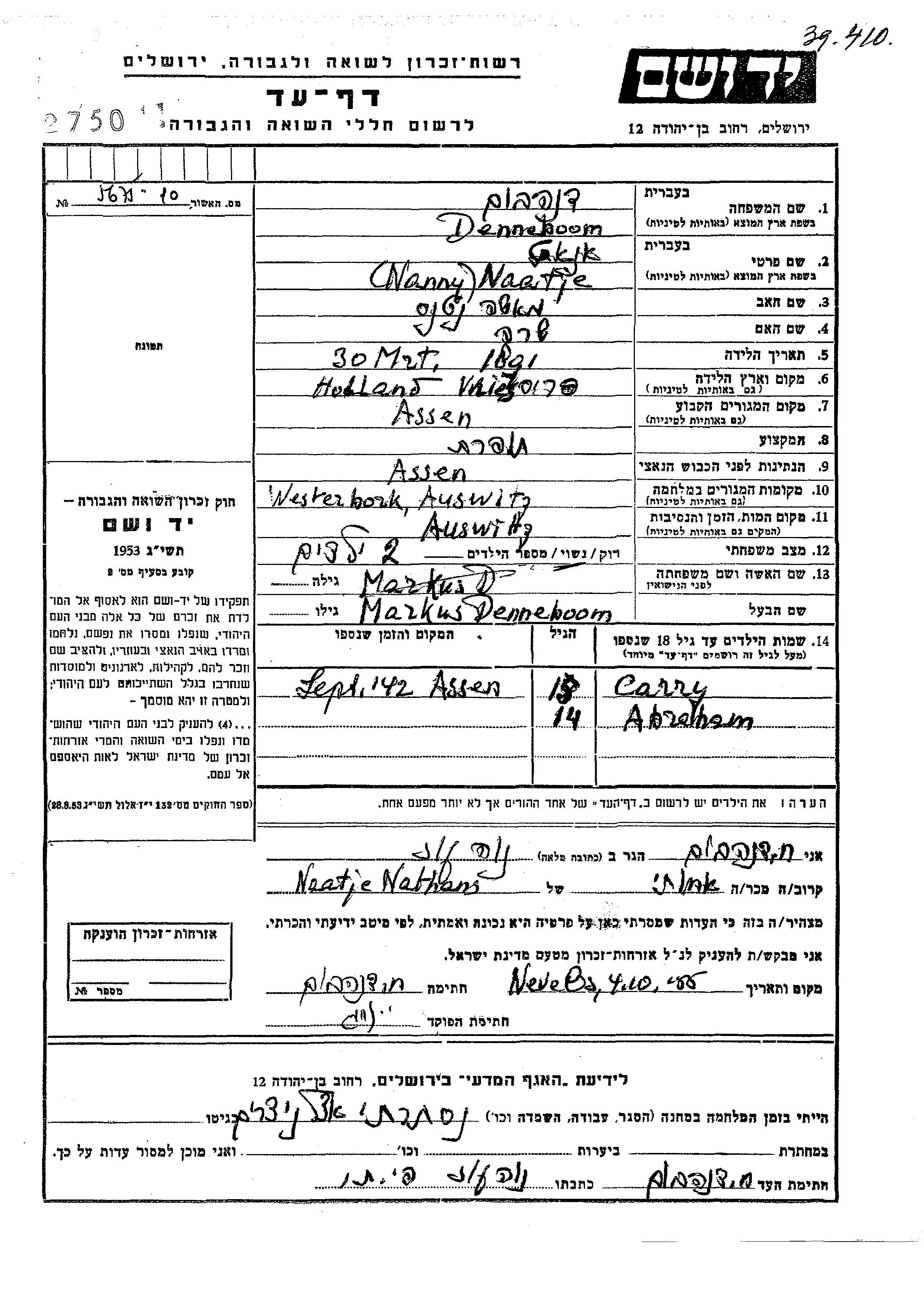Carry Denneboom est née fille de Markus et de Naatje née Natans. Elle était Enfant. Avant la seconde guerre mondiale elle vivait à Assen, Pays-Bas. Pendant la guerre, elle était à Westerbork, Pays Bas.