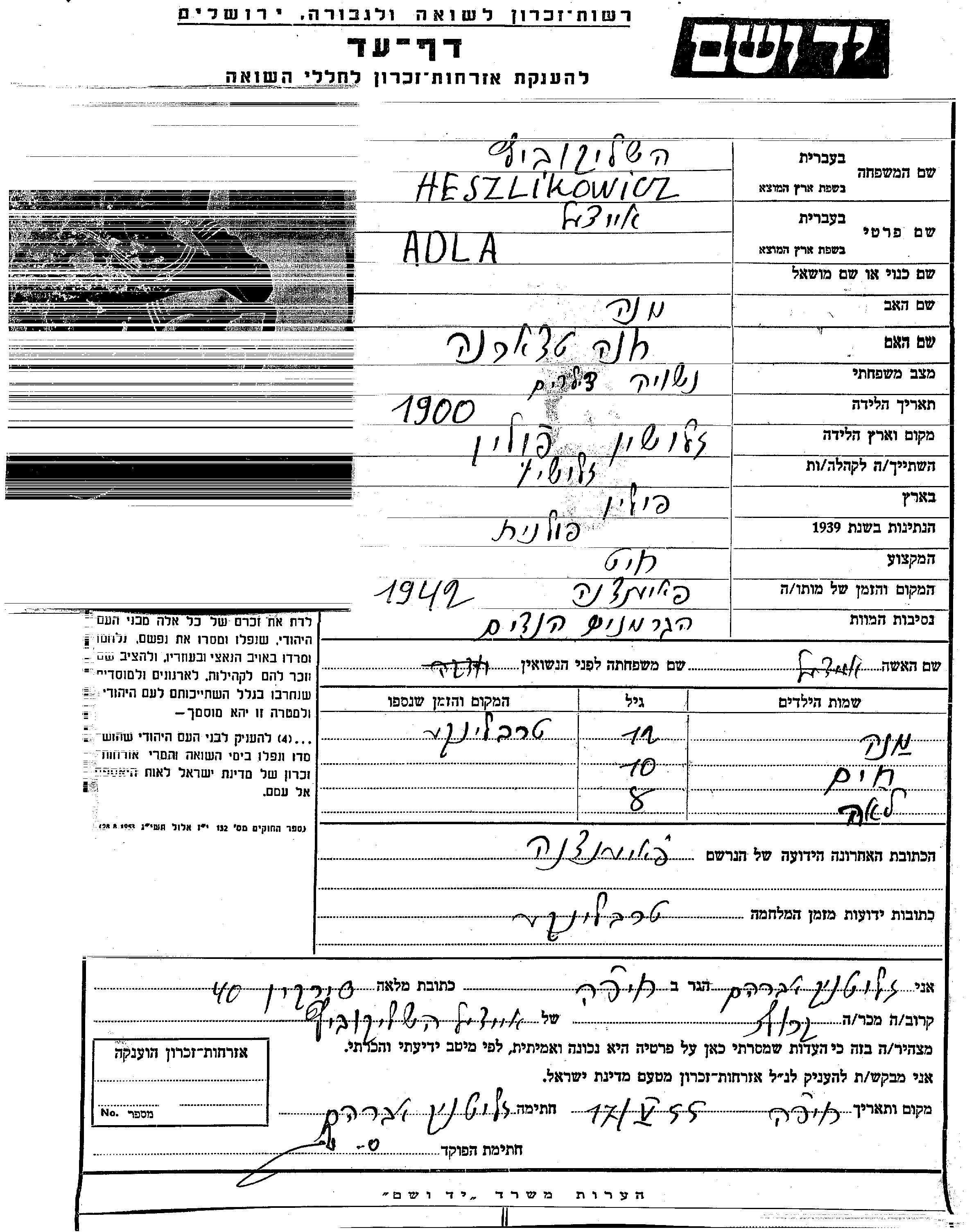 Heszlikowicz Lea Dzialoszyn, Pologne Feuille de témoignage