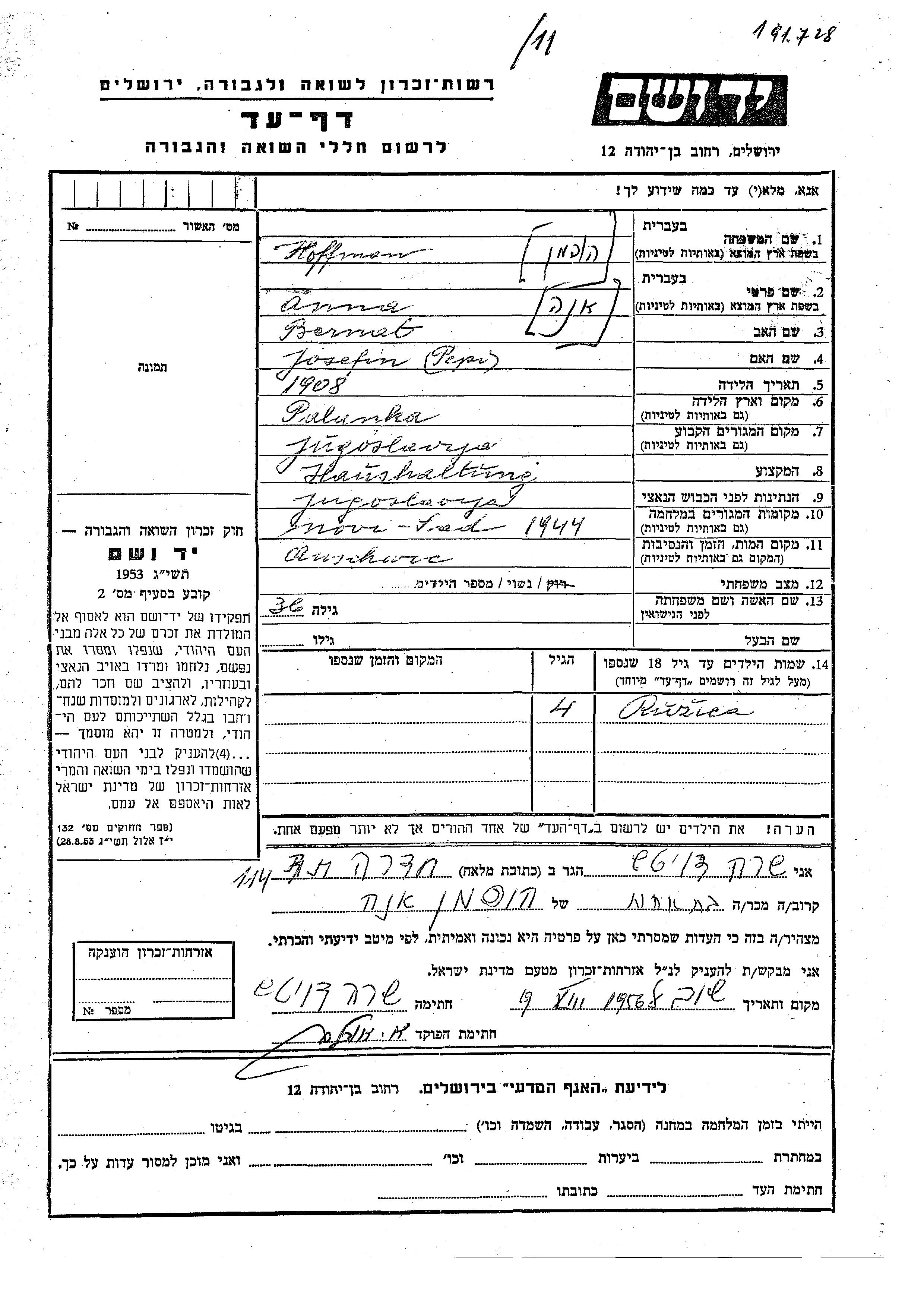 Hoffman Ruzena endroit inconnu, Feuille de témoignage