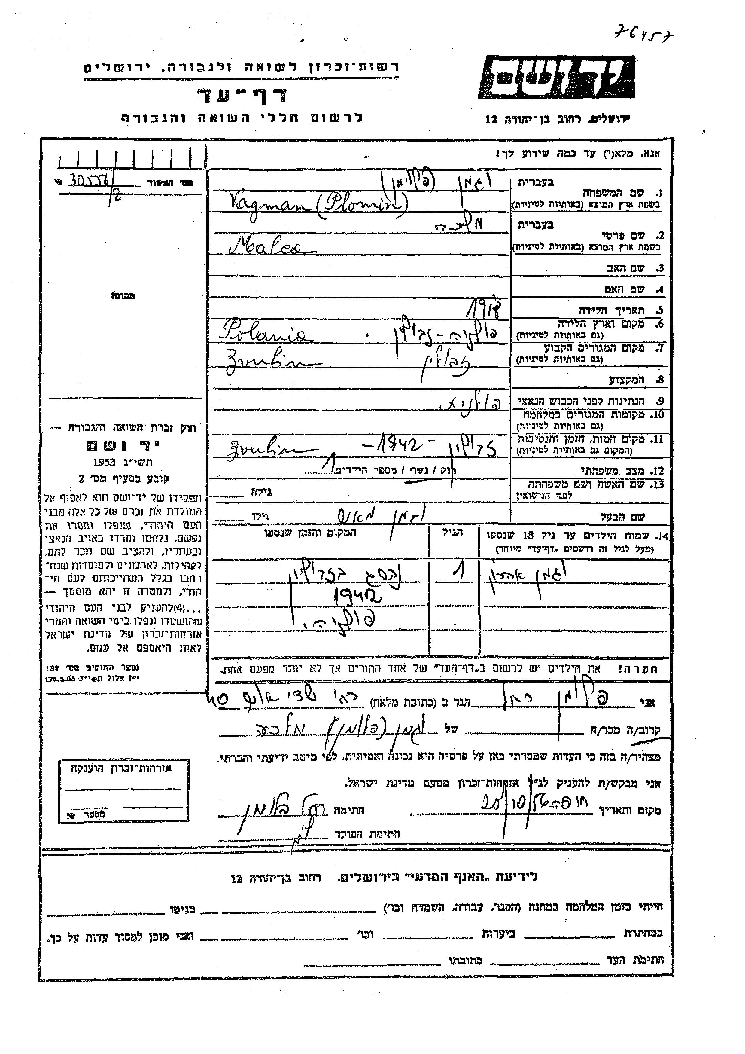 Aharon Plomin Vagman Flomen est né fils de Mosh et de Malca. Il était Enfant. Avant la seconde guerre mondiale il vivait à Zwolin, Pologne.