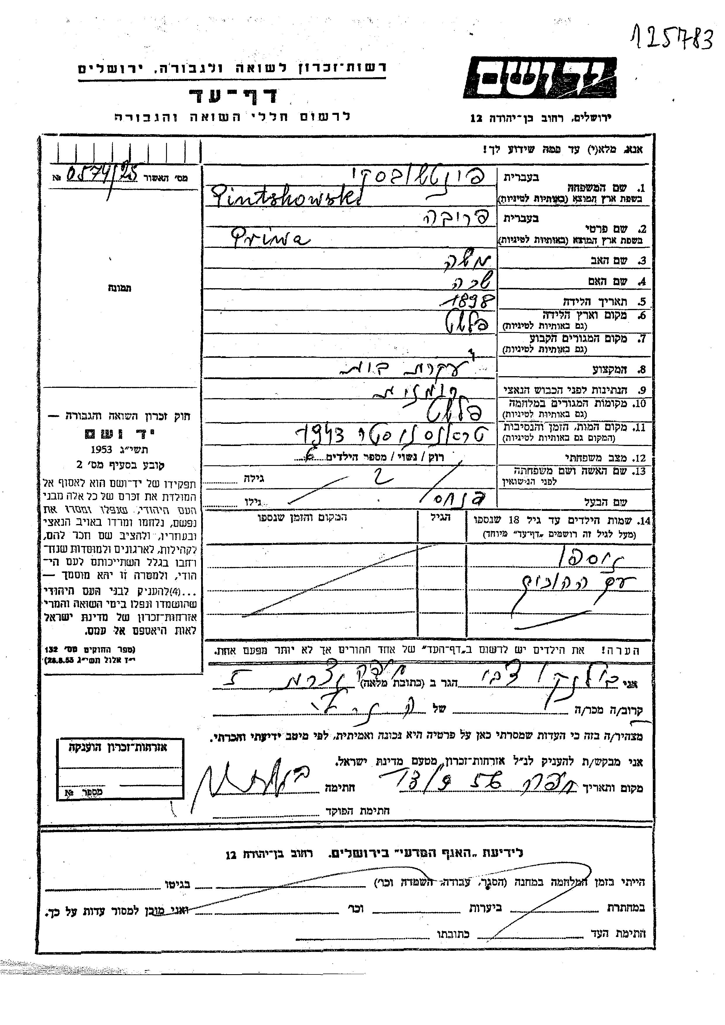 Priwa Pintshowski est née à Falesti, Roumanie en 1898, fille de Moshe et de Sara. Elle était Femme au foyer et Mariée à Pinkhas. Avant la seconde guerre mondiale elle vivait à Falesti, Roumanie. Pendant la guerre, elle était à Falesti, Roumanie.