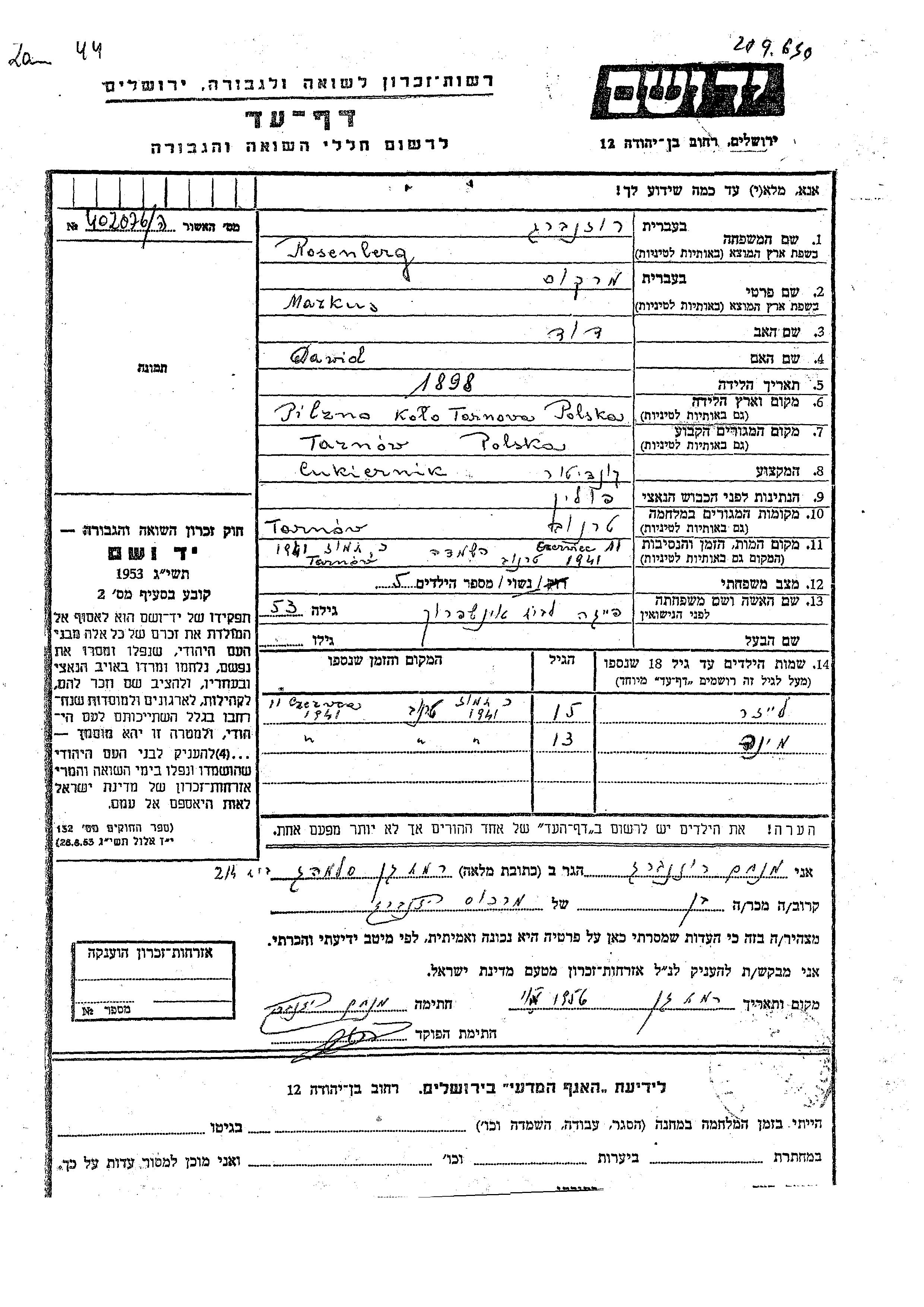Yad Vashem - Pages of Testimony Names Memorial Collection