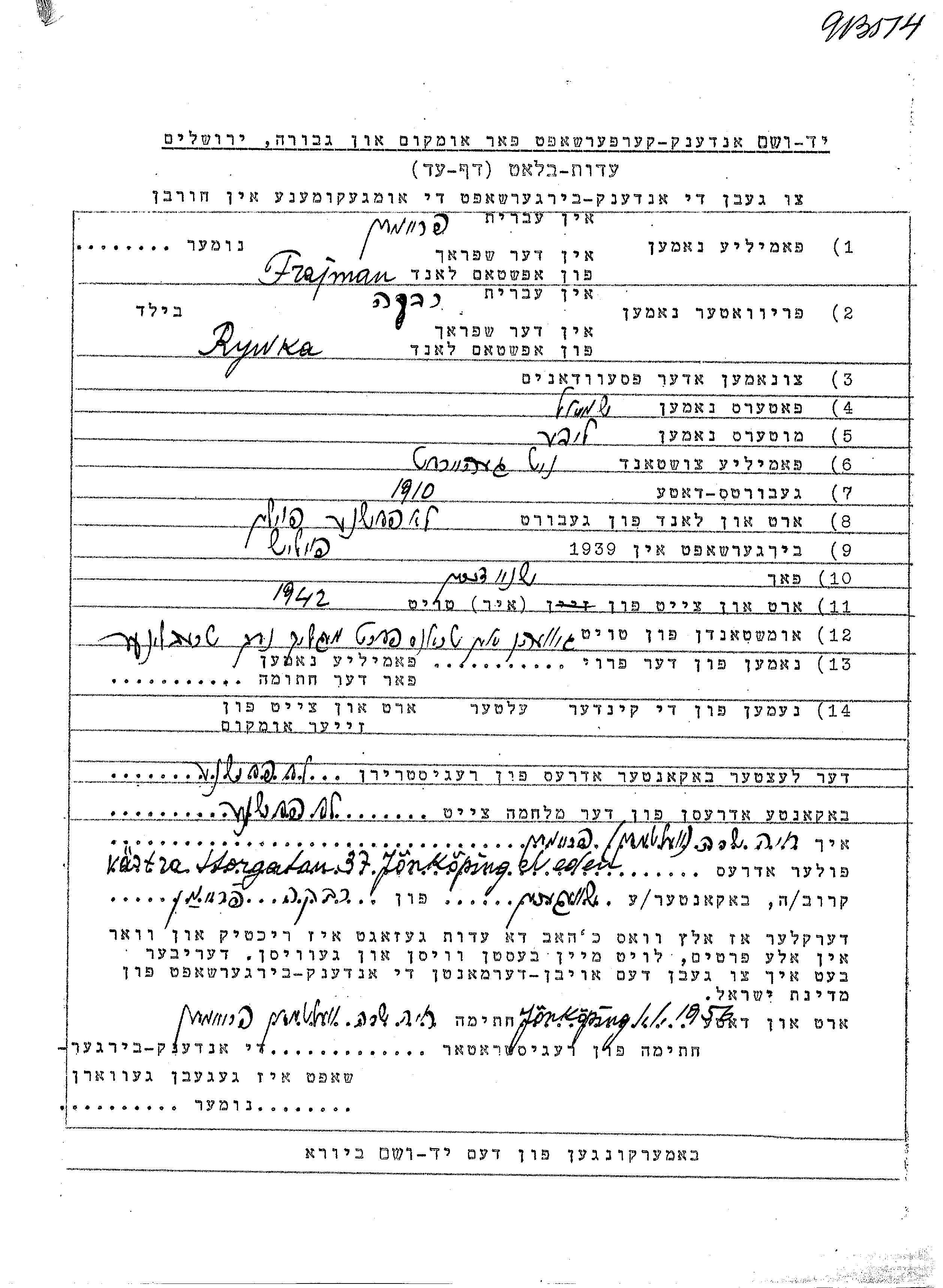 Frajman Rywka 1910 Lopuszno, Pologne Feuille de témoignage