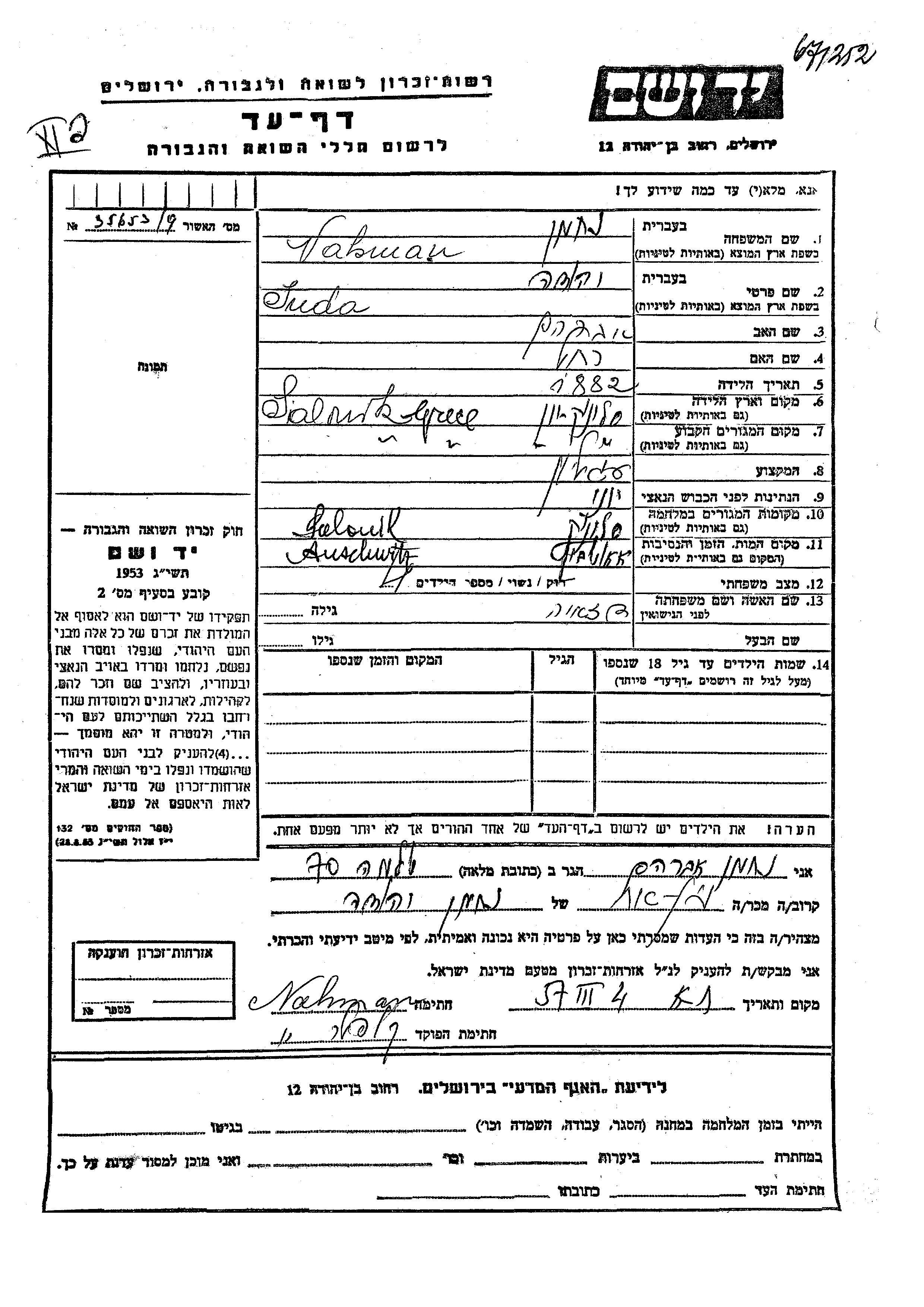 Nachman Juda 1882 Saloniki, Grèce Feuille de témoignage