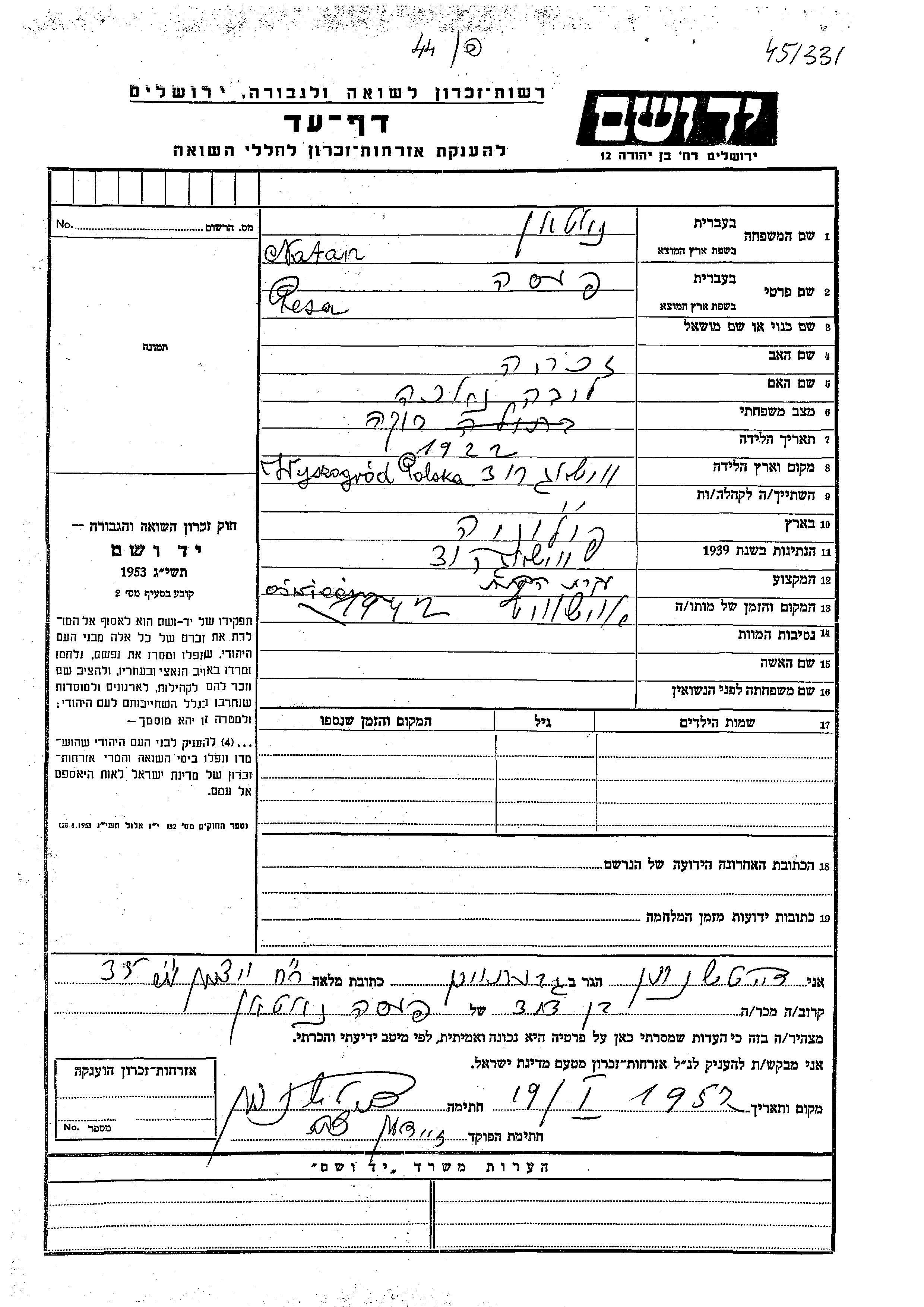 Yad Vashem - Pages of Testimony Names Memorial Collection