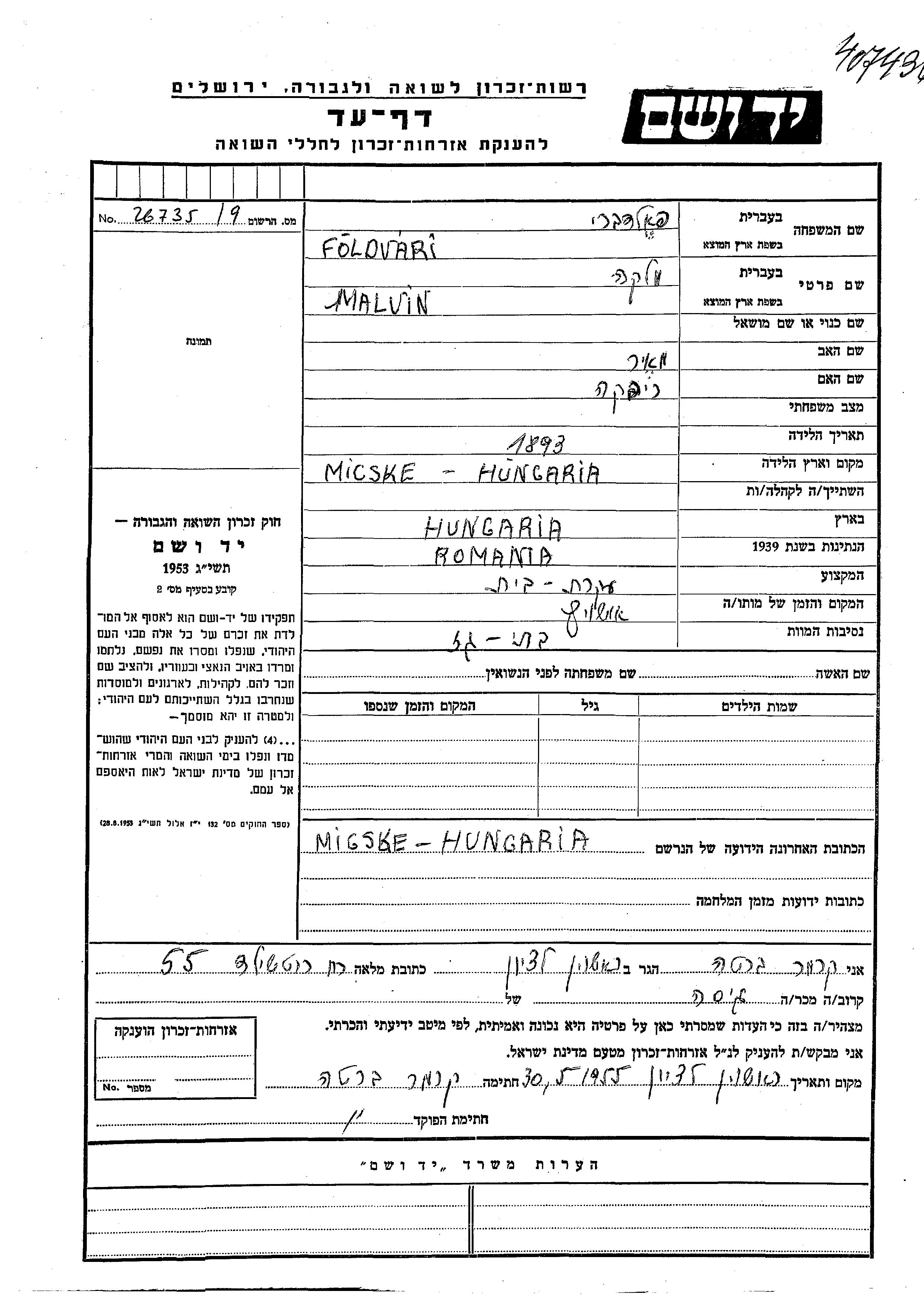 Malka Malvin Foldvari est née à Micske, Hongrie en 1893, fille de Meir et de Rivka. Elle était Femme au foyer. Avant la seconde guerre mondiale elle vivait à Hongrie. Pendant la guerre, elle était à Micske, Hongrie.