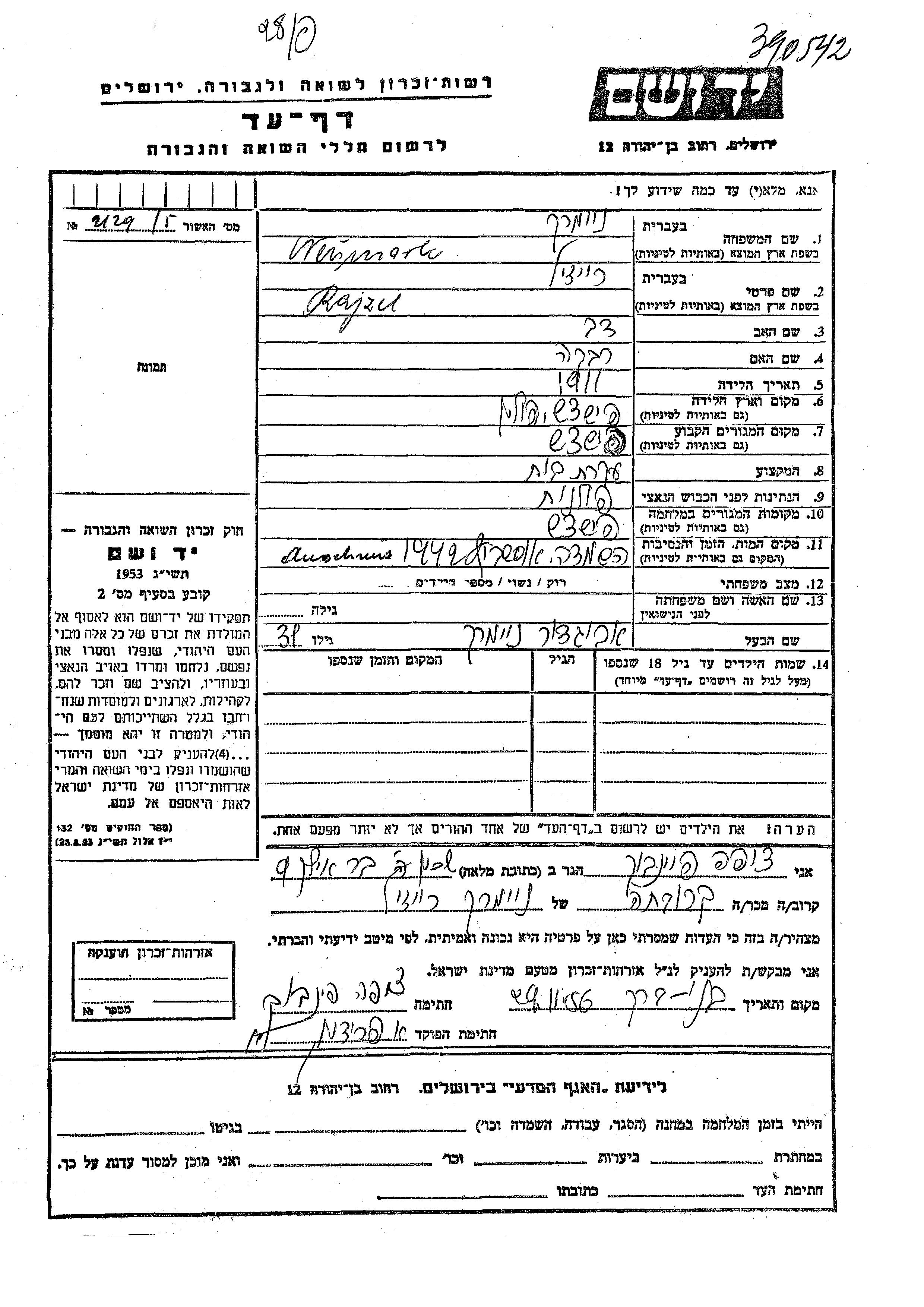 Rajzl Neumark est née à Pishtzatz, Pologne en 1911, fille de Dov et de Rivka. Elle était Femme au foyer et Mariée à Avigdor. Avant la seconde guerre mondiale elle vivait à Pishtzatz, Pologne. Pendant la guerre, elle était à Pishtzatz, Pologne.