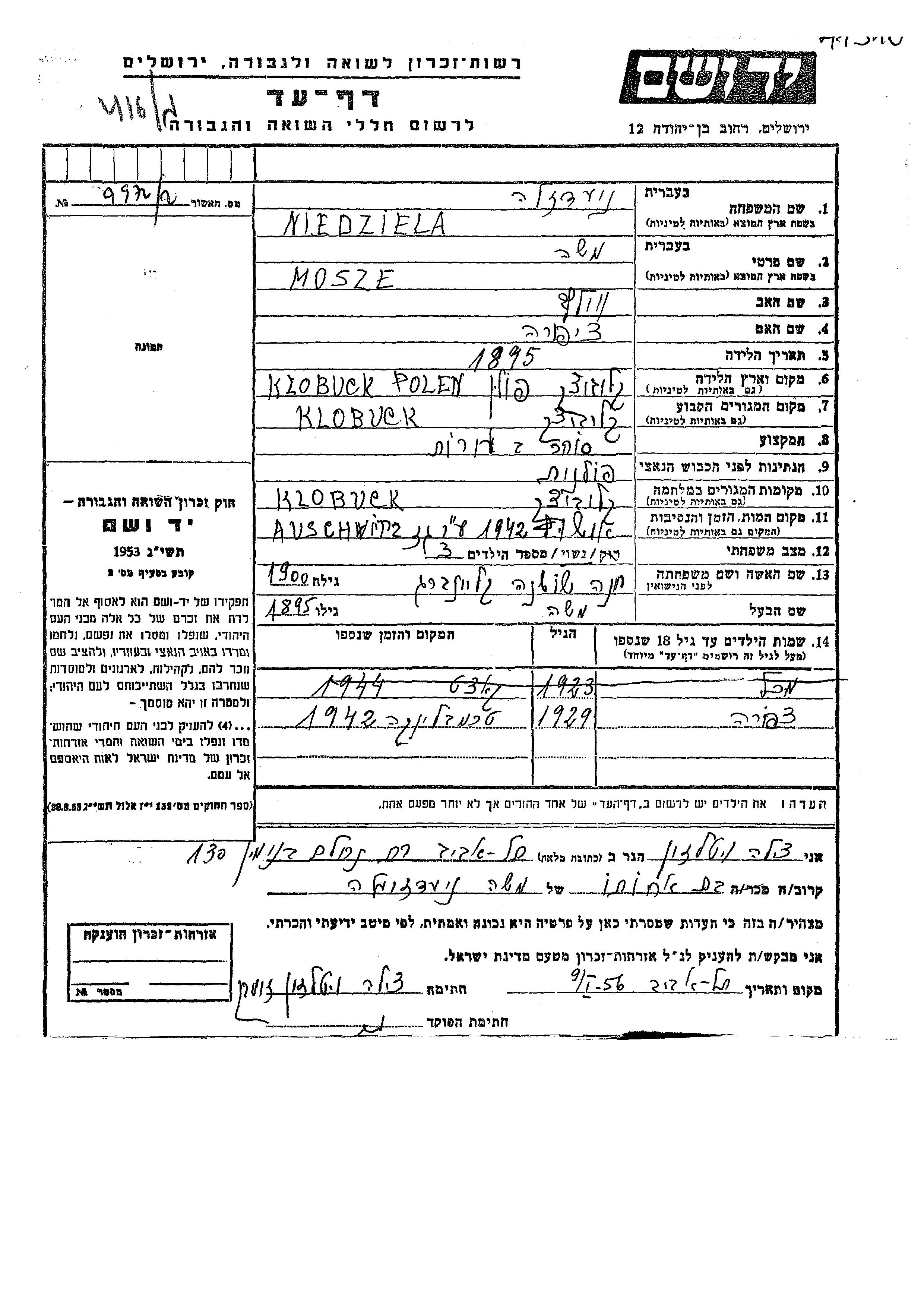 Mosze Niedziela est né à Klobuck, Pologne en 1895, fils de Volf et de Tzipora. Il était Maroquinier et Mariée à Khana Shoshana née Kleinberg. Avant la seconde guerre mondiale il vivait à Klobuck, Pologne. Au cours de la guerre, il était à Klobuck, Pologne.