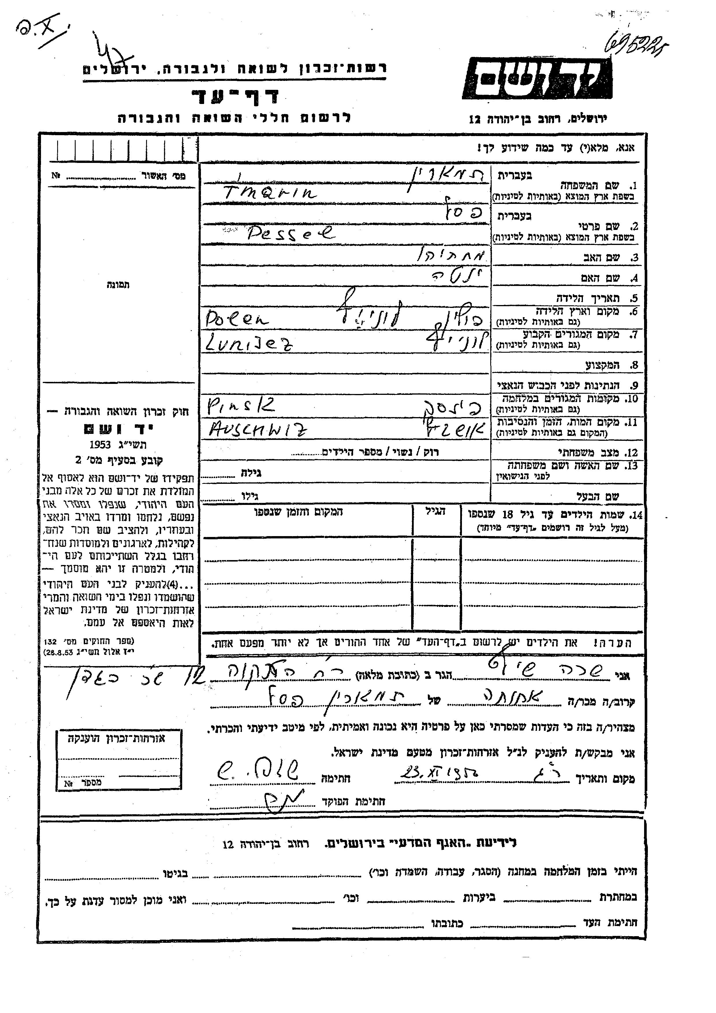 Tmarin Pessel Lunyayetz, Pologne Feuille de témoignage