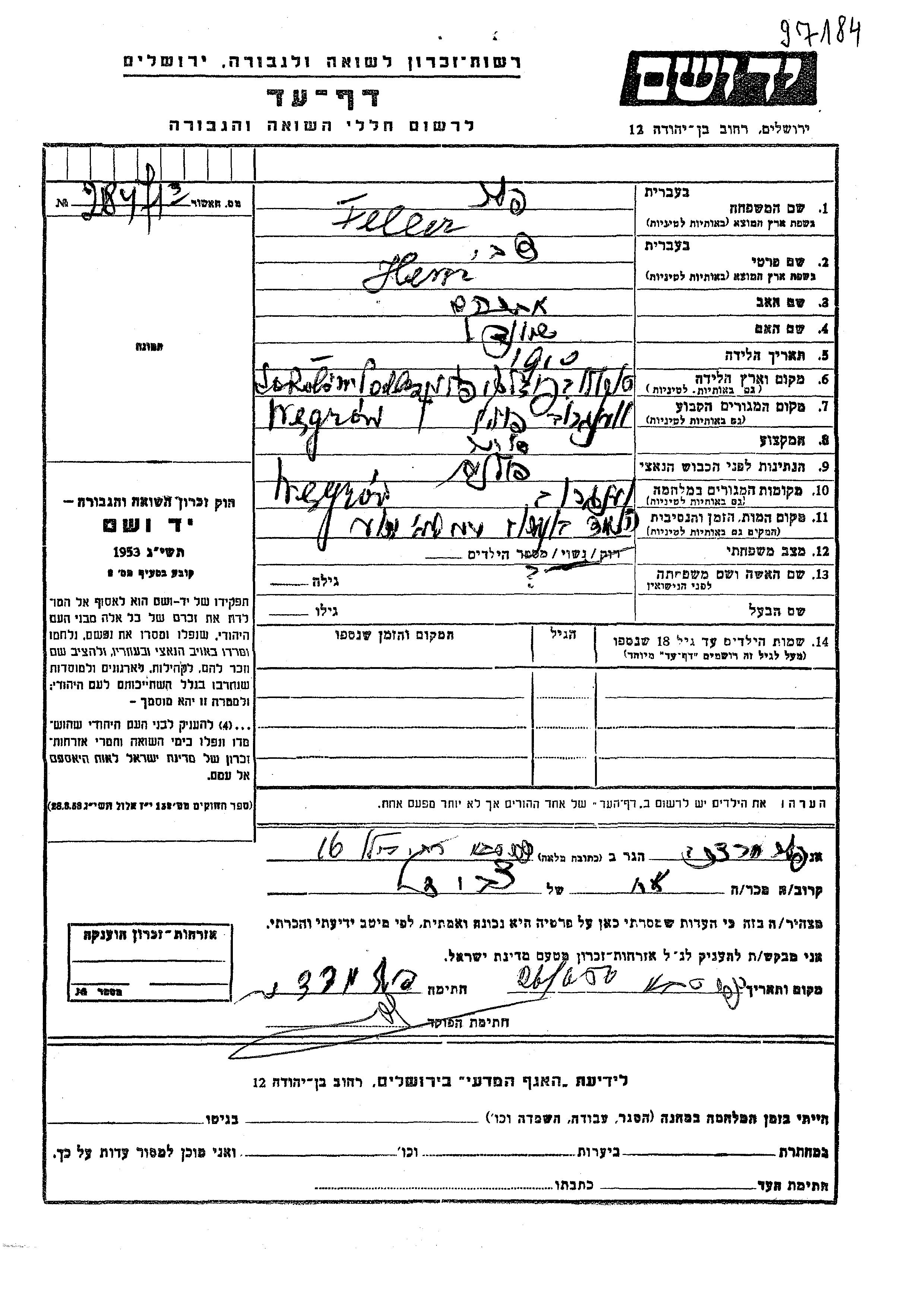 Feller Hersz Tzvi 1910 Wegrow, Pologne Feuille de témoignage