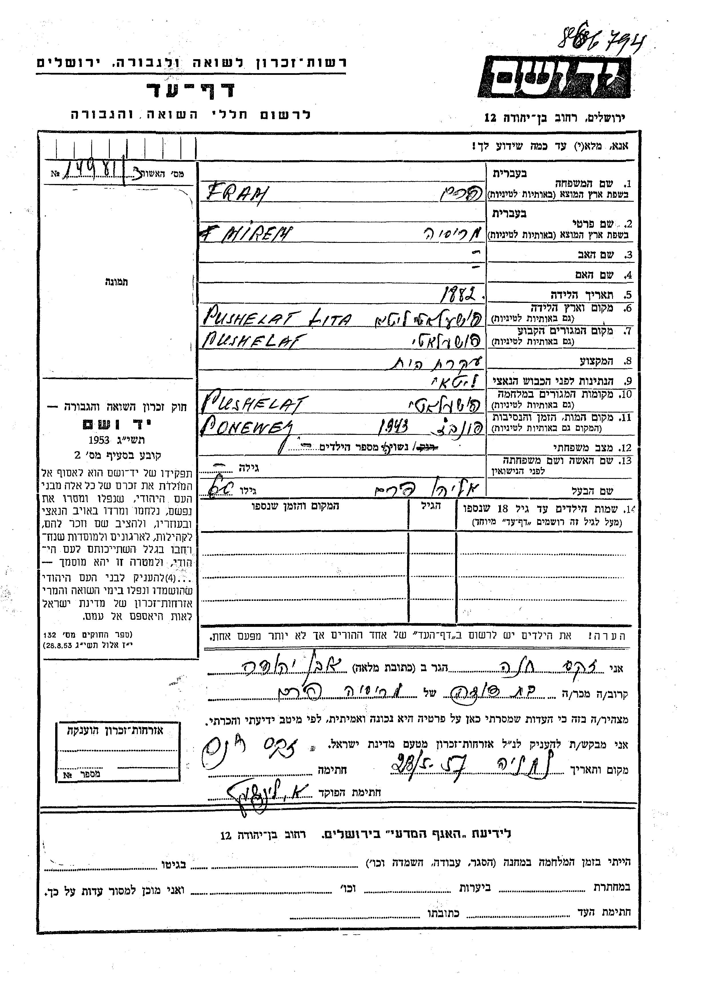 Mirem Maria Fram est née à Pushelat, Lituanie en 1882. Elle était Femme au foyer et Mariée à Eliahu. Avant la seconde guerre mondiale elle vivait à Pushelat, Lituanie. Pendant la guerre, elle était à Pushelat, Lituanie.