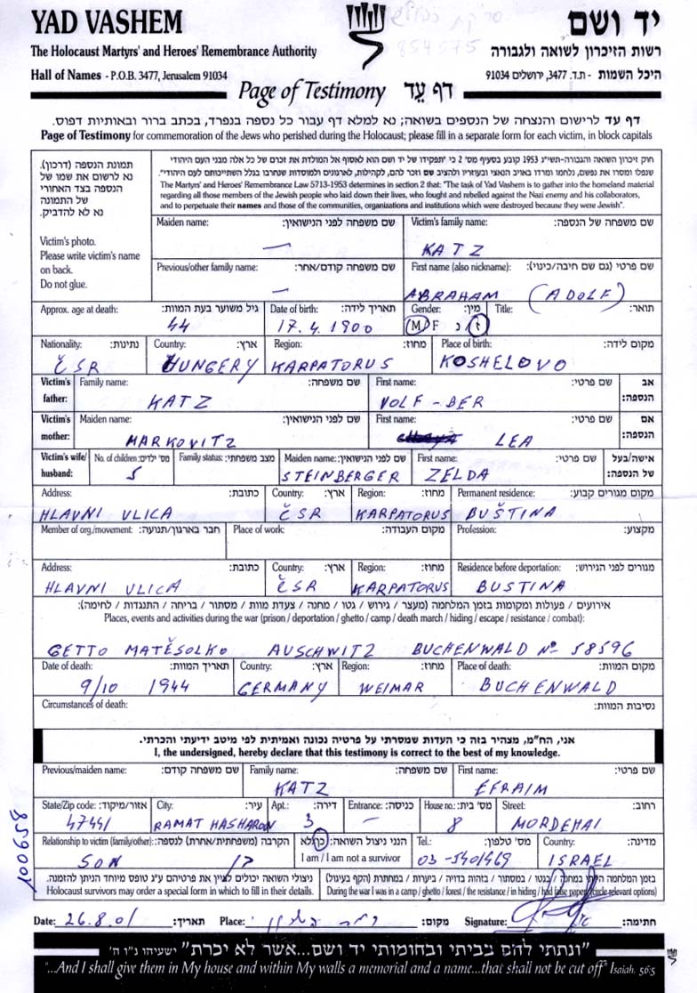 Abraham Katz est né à Koselovo, Tchécoslovaquie en 1900, fils de Hersh Leib et de Lea. Il était Mariée à Zelda née Shtinberger. Avant la seconde guerre mondiale il vivait à Bustina, Tchécoslovaquie. Au cours de la guerre, il était à Bustina, Tchécoslovaquie.