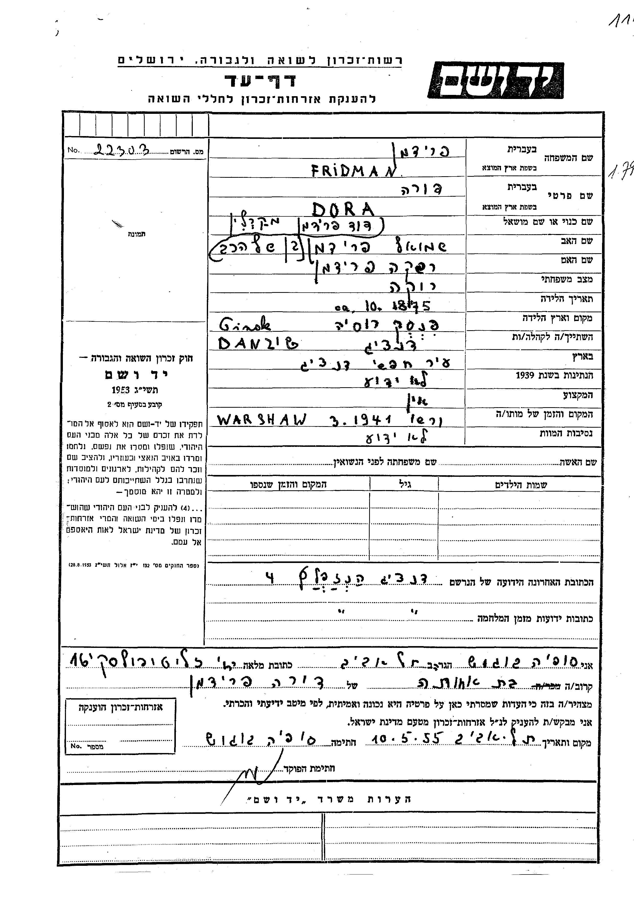 Dora Fridman est née à Pinsk, Pologne en 1875, fille de Shmuel et de Rashka. Avant la seconde guerre mondiale elle vivait à Danzig, Ville Franche de Danzig. Pendant la guerre, elle était à Danzig, Ville Franche de Danzig.
