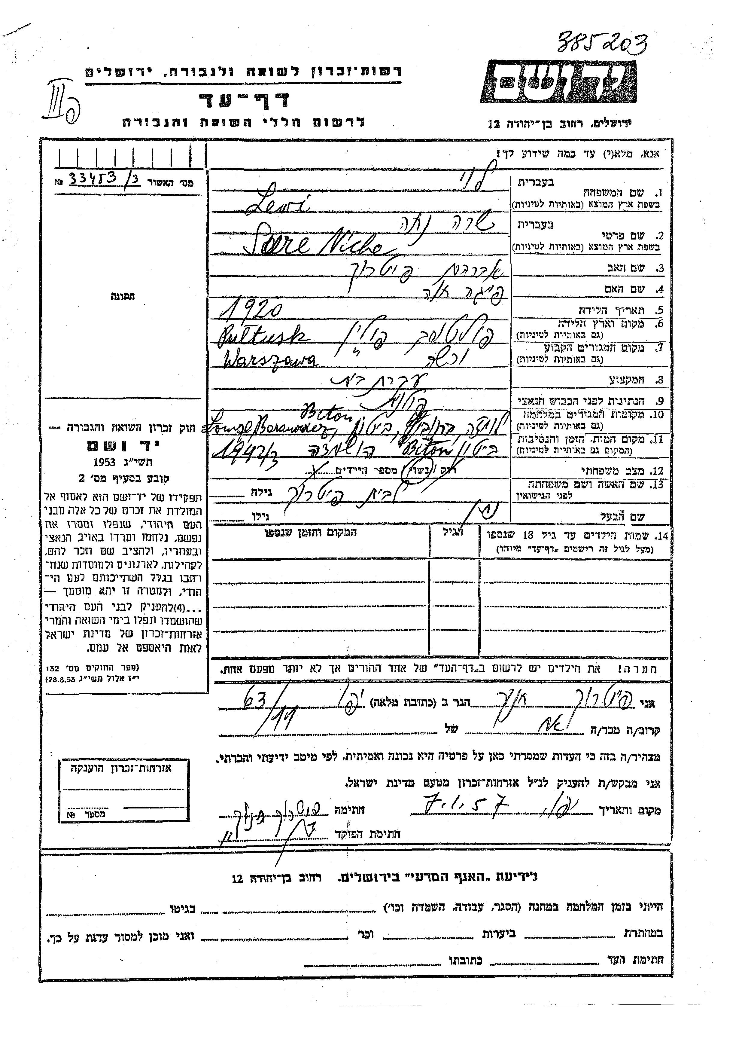 Sure Niche Levi née Pitrukh est née à Pultusk, Pologne en 1920, fille de Avraham et de Feiga Khava. Elle était Femme au foyer et Mariée à Natan. Avant la seconde guerre mondiale elle vivait à Warsaw, Pologne. Pendant la guerre, elle était à Łomża, Pologne.