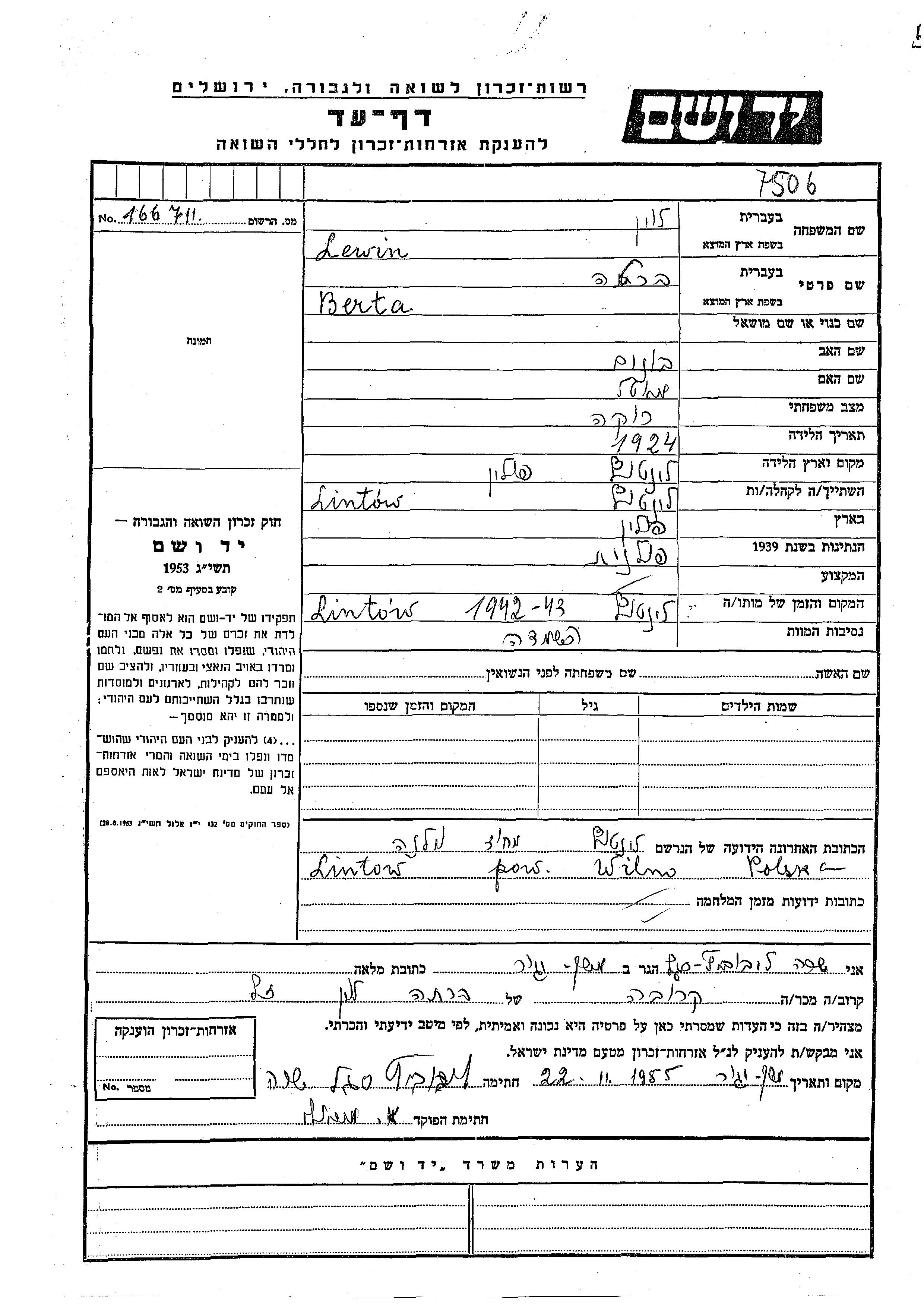Lewin Berta 1924 Lintchitz, Pologne Feuille de témoignage