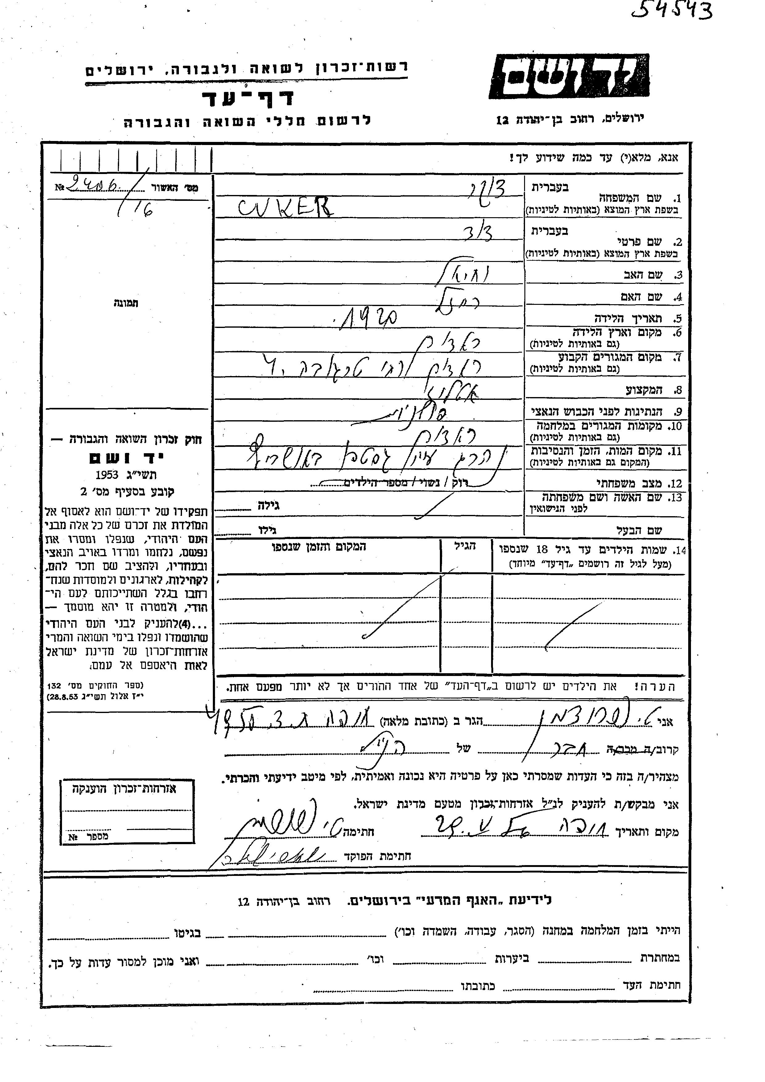 Cuker David 1920 Radom, Pologne Feuille de témoignage