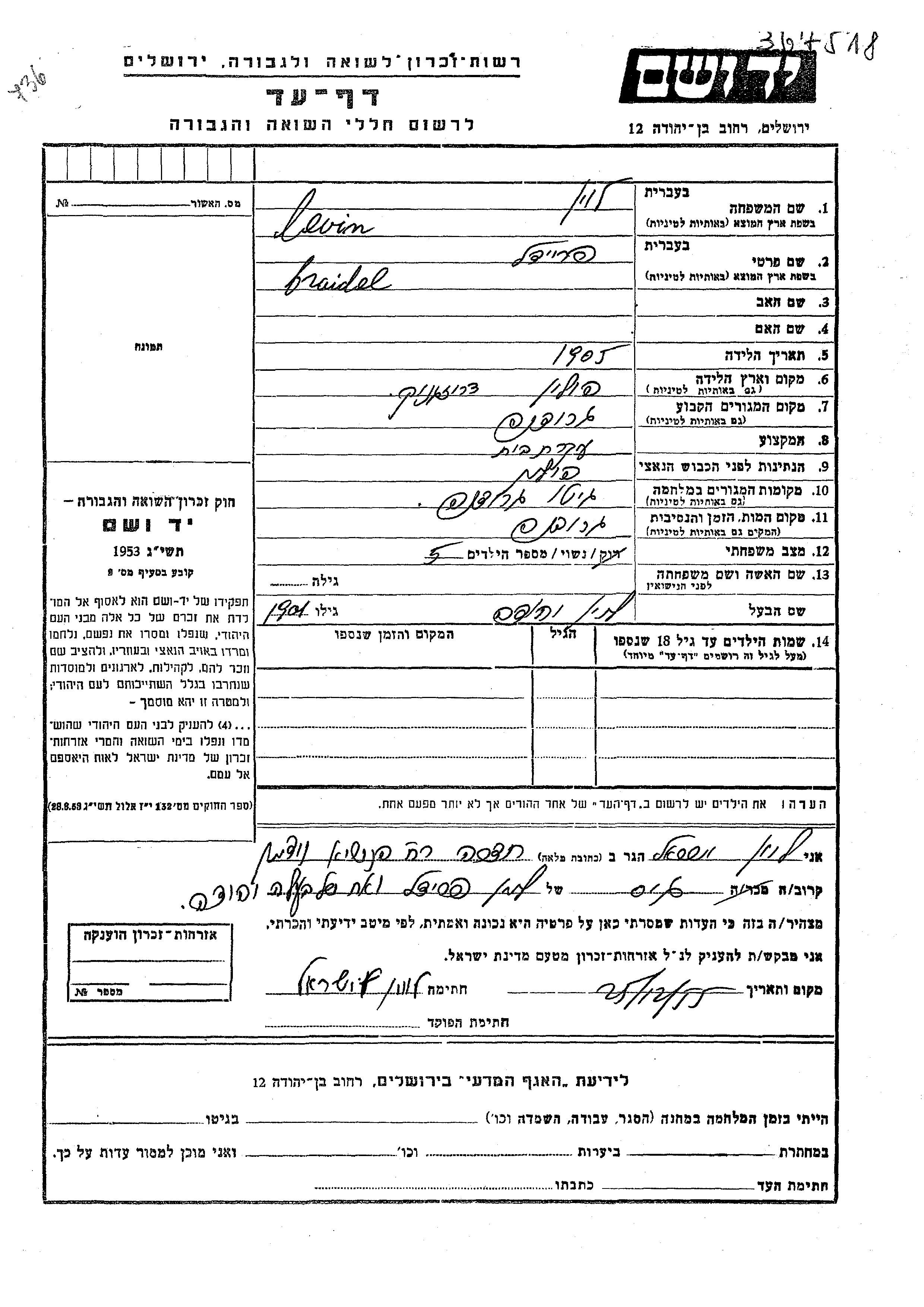 Fraidel Levin est née à Drozgenik, Pologne en 1905. Elle était Femme au foyer et Mariée à Yehuda. Avant la seconde guerre mondiale elle vivait à Grodno, Pologne. Pendant la guerre, elle était à Grodno, Pologne.