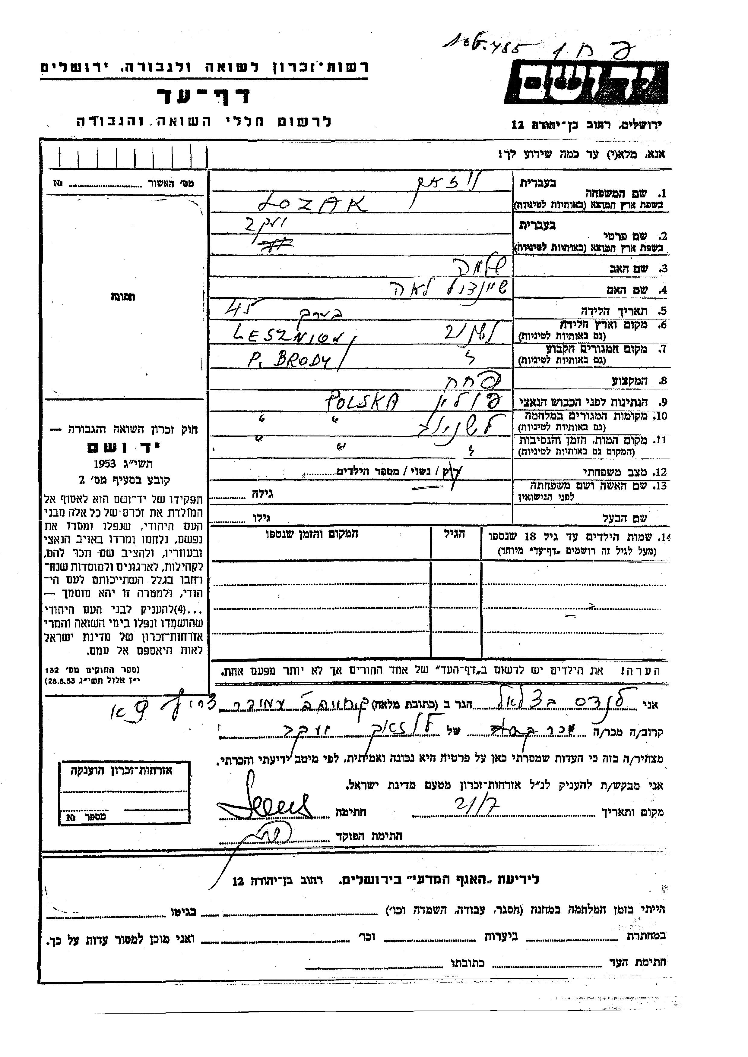 Lozak Yaakov Leszniow, Pologne Feuille de témoignage