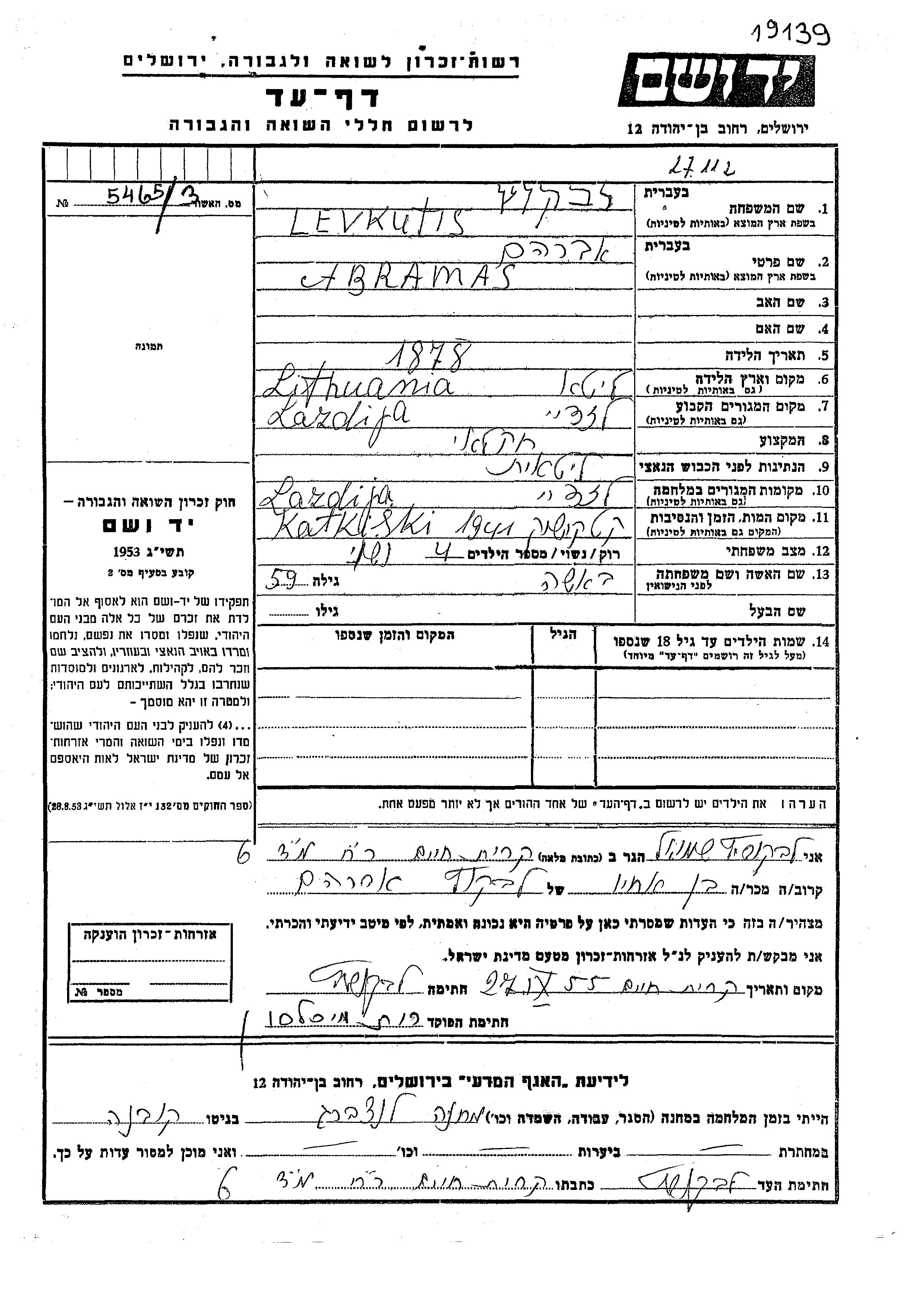 Abramas Levkutis est né à Lituanie en 1878. Il était Agriculteur et Mariée à Basha. Avant la seconde guerre mondiale il vivait à Lazdijai, Lituanie. Au cours de la guerre, il était à Lazdijai, Lituanie.
