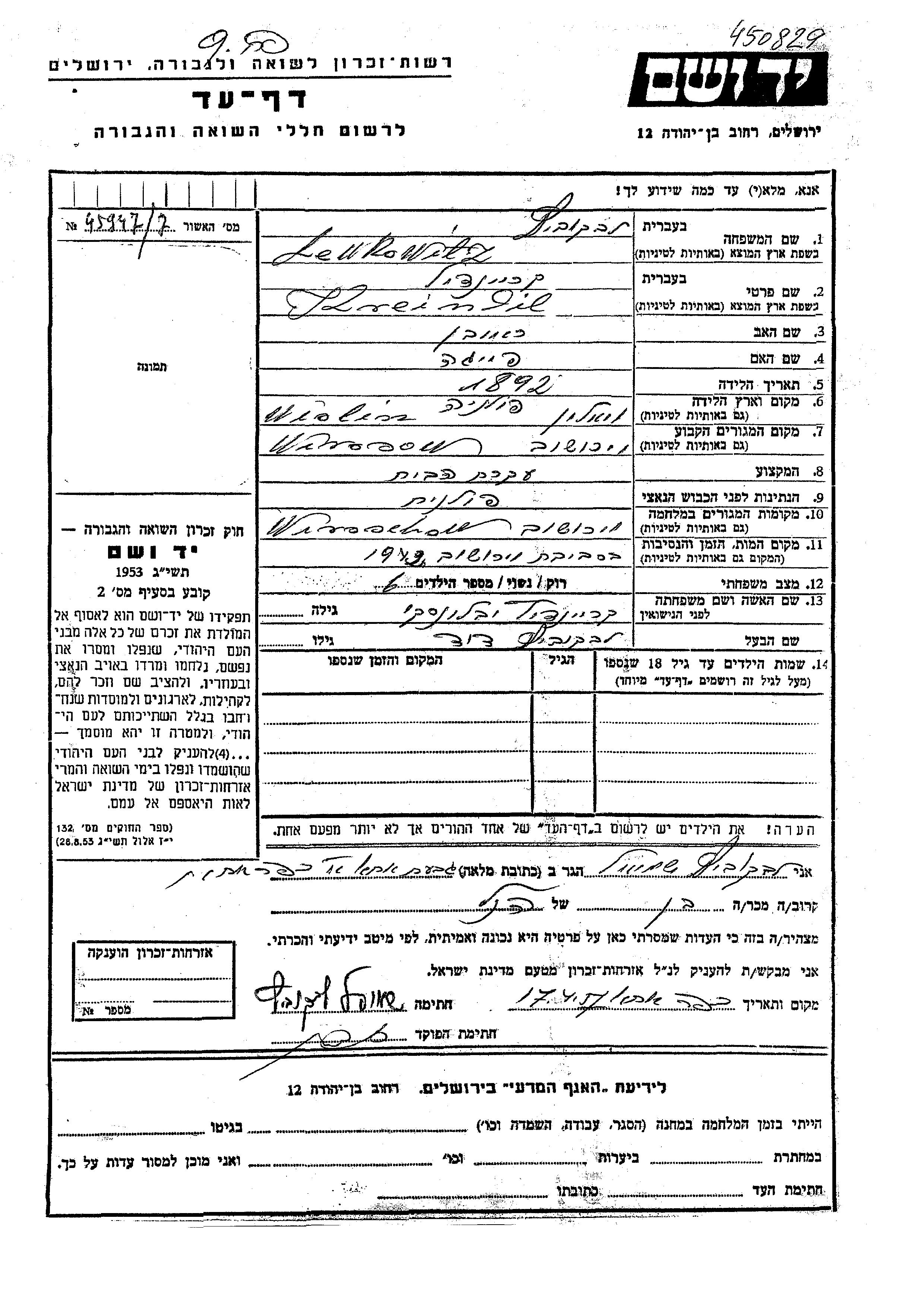 Yad Vashem - Pages of Testimony Names Memorial Collection