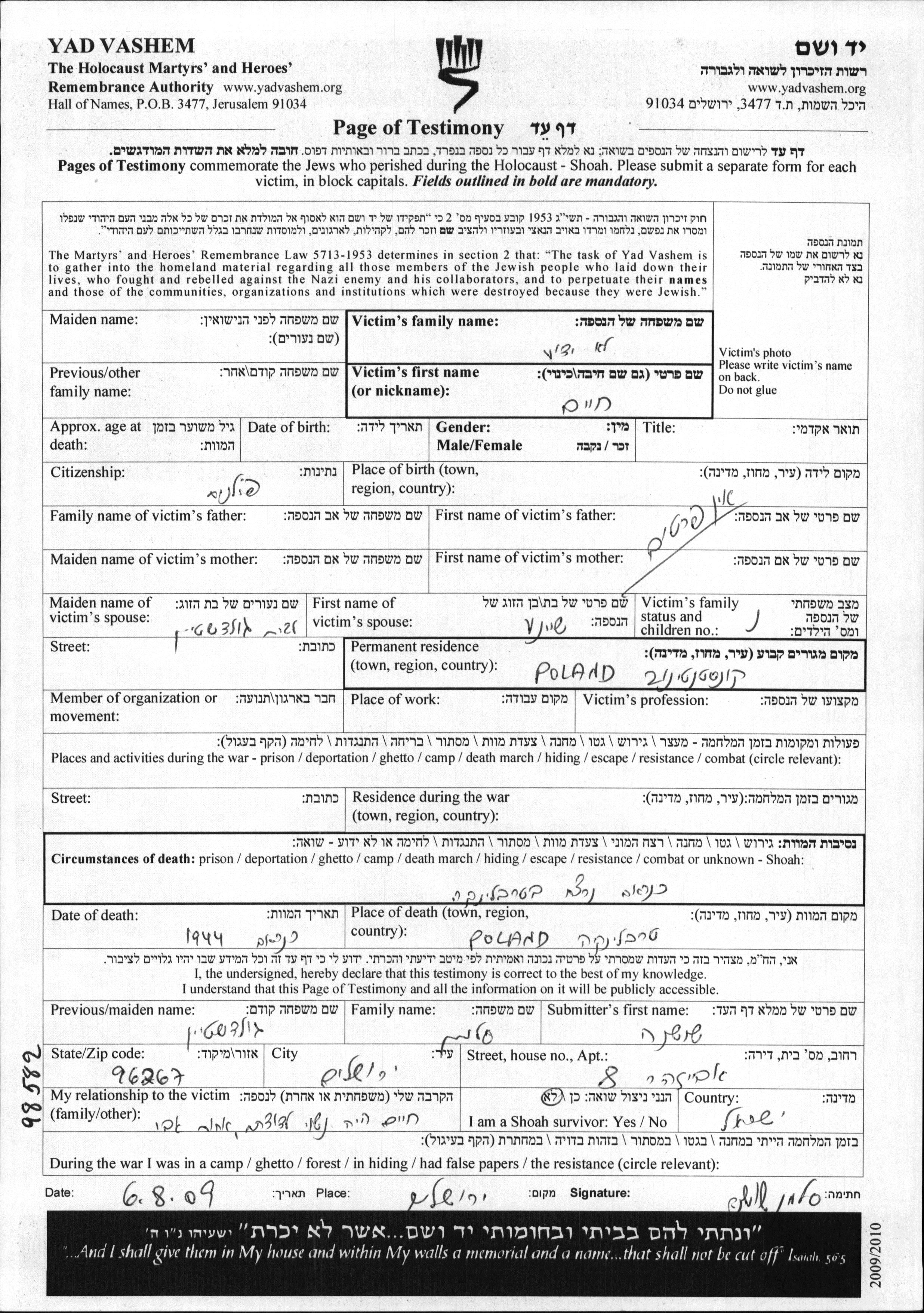 Yad Vashem - Pages of Testimony Names Memorial Collection