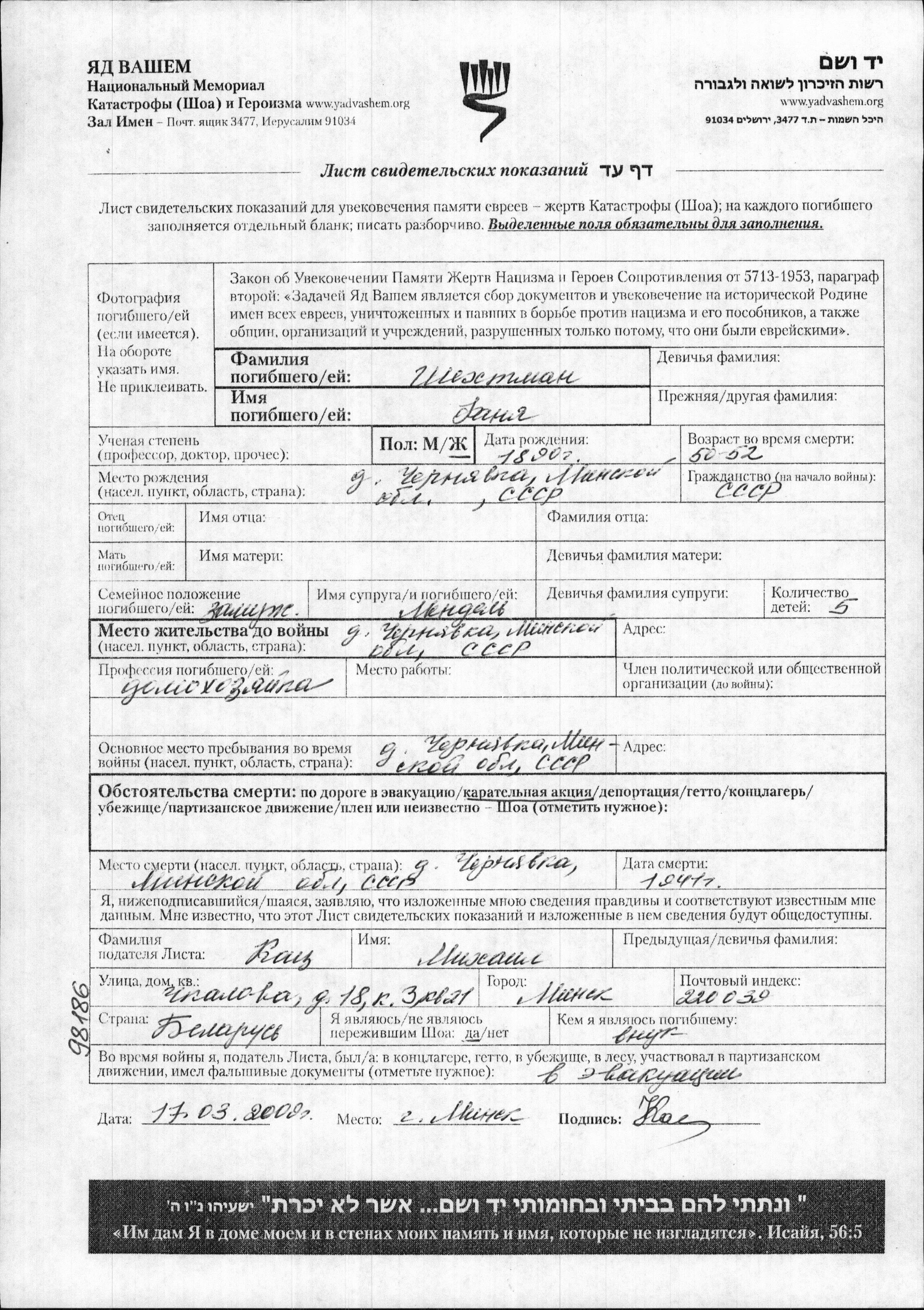 Shekhtman Fanya Chernyavka, Bélorussie (URSS) Feuille de témoignage