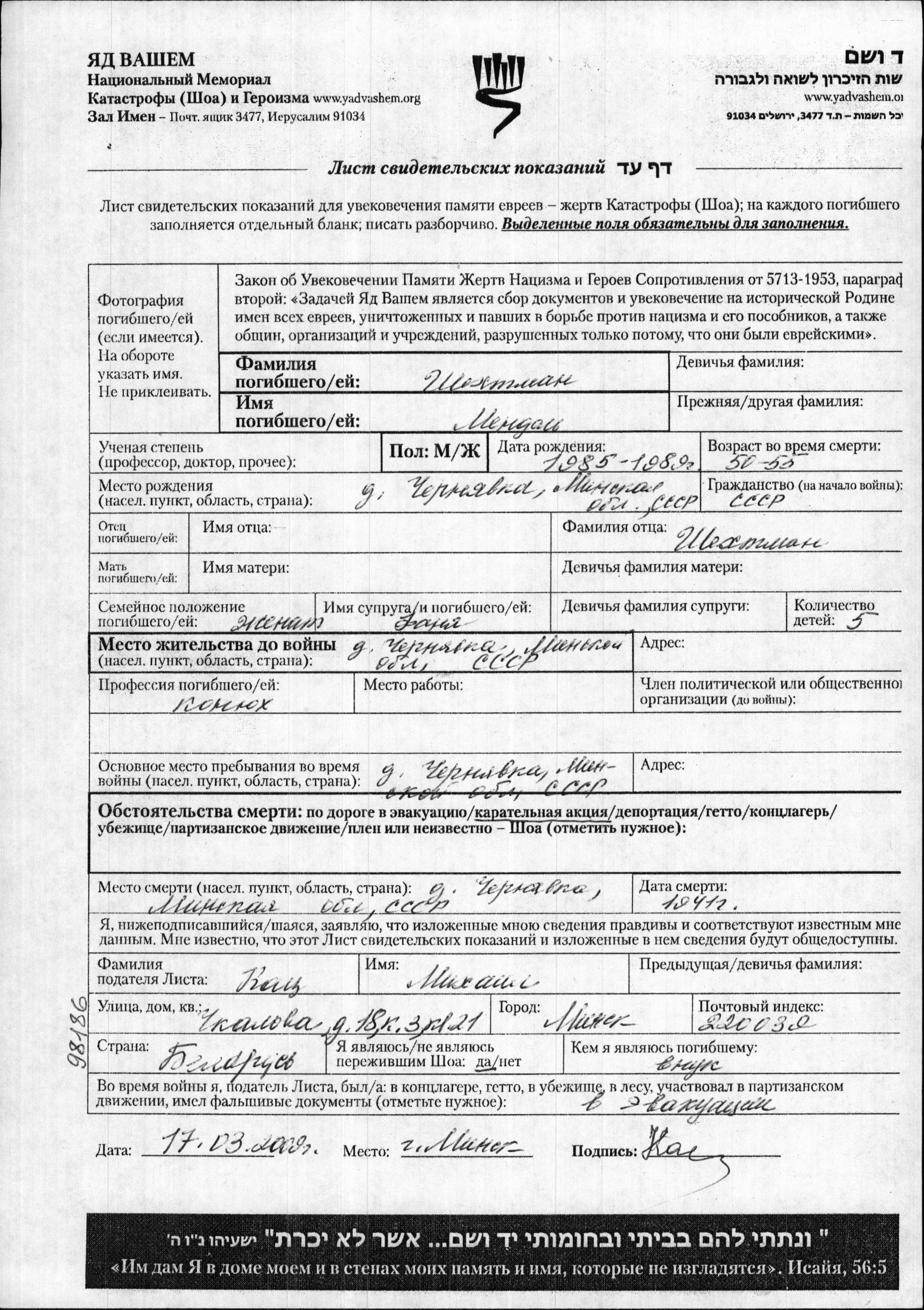 Shekhtman Mendel Chernyavka, Bélorussie (URSS) Feuille de témoignage