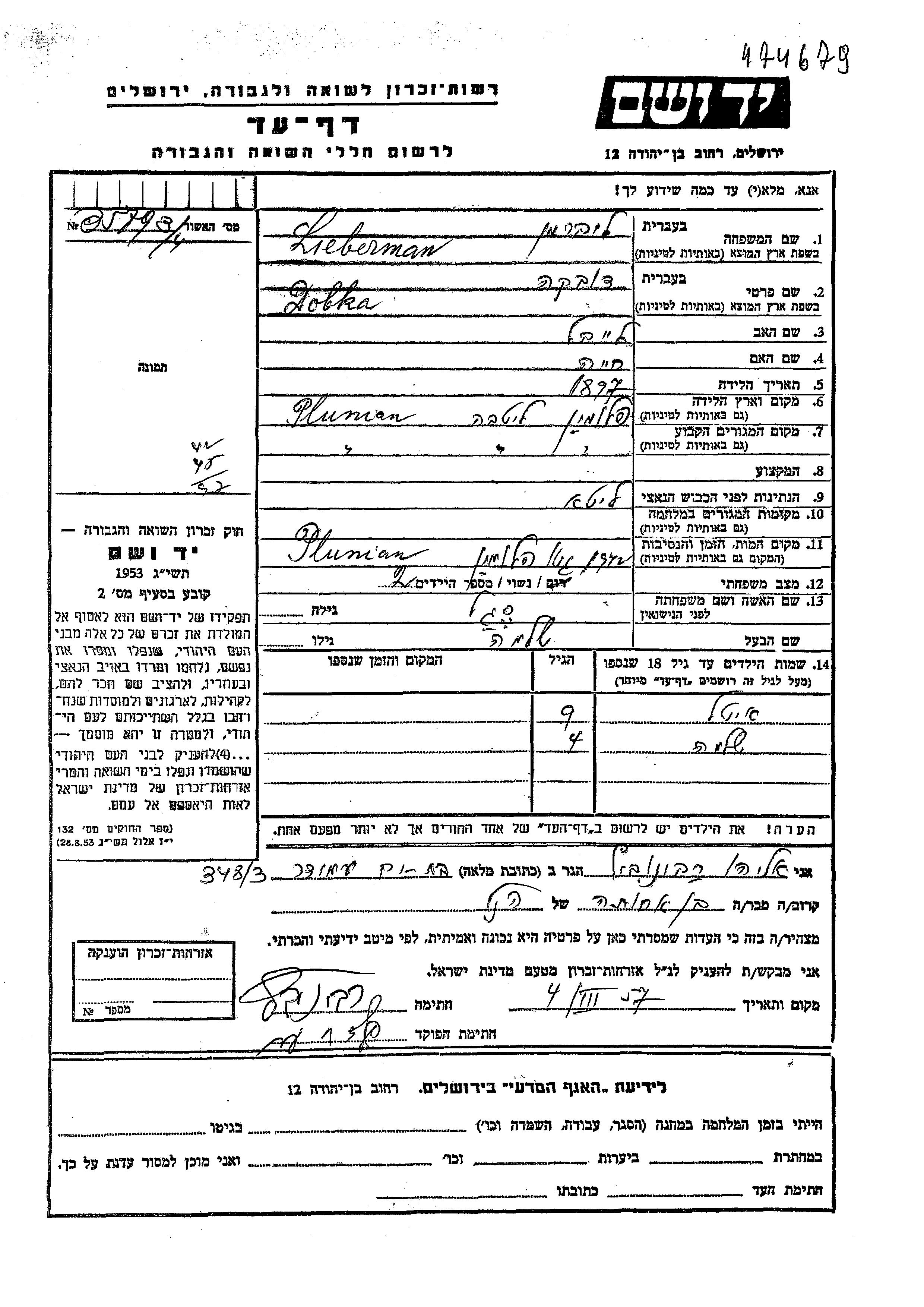 Dobka Lieberman née Segal est née à Plunian, Lituanie en 1897, fille de Leibel et de Khaia. Elle était Mariée à Shlomo. Avant la seconde guerre mondiale elle vivait à Plunian, Lituanie.