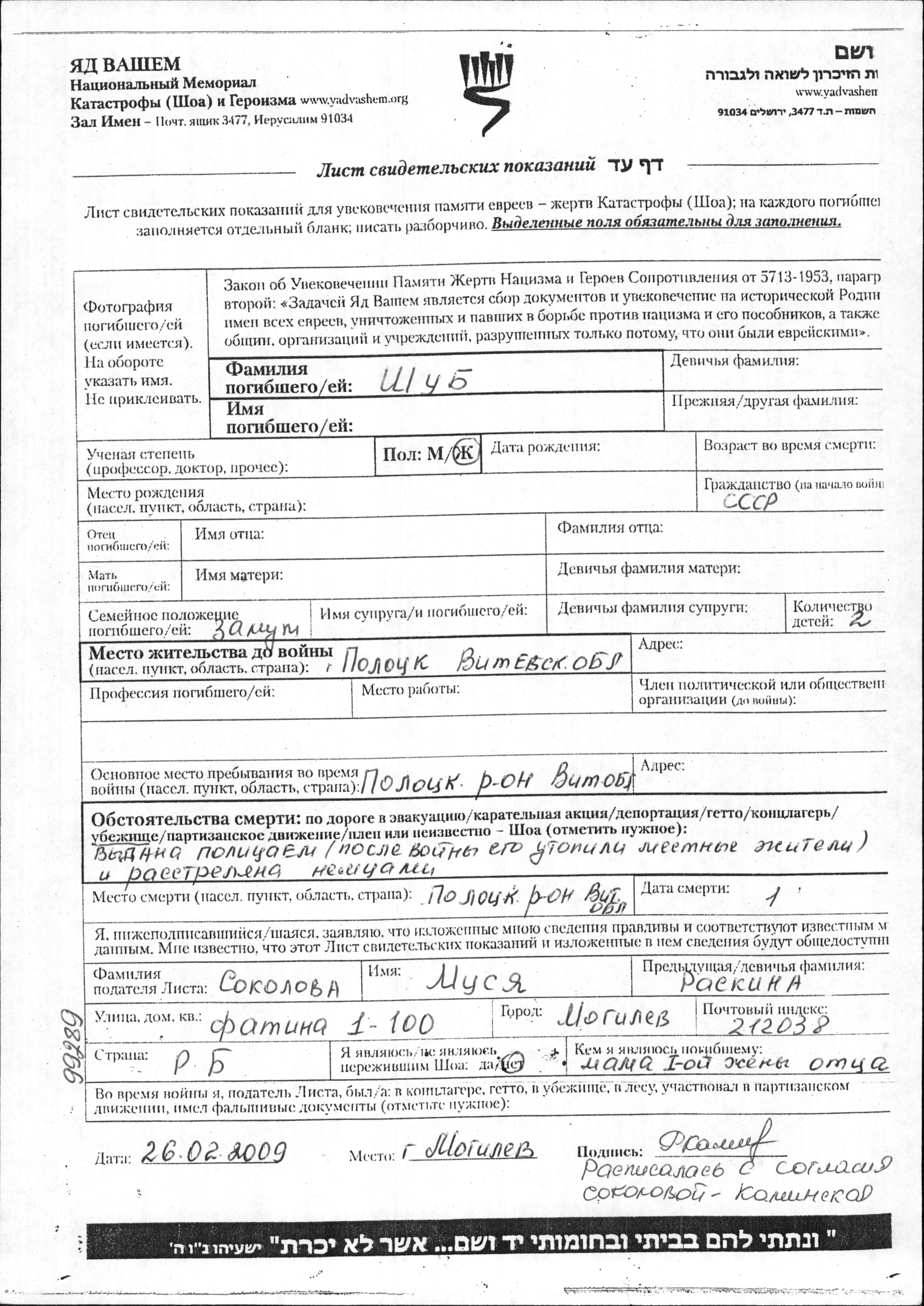 Shub prénom inconnu Polotsk, Bélorussie (URSS) Feuille de témoignage