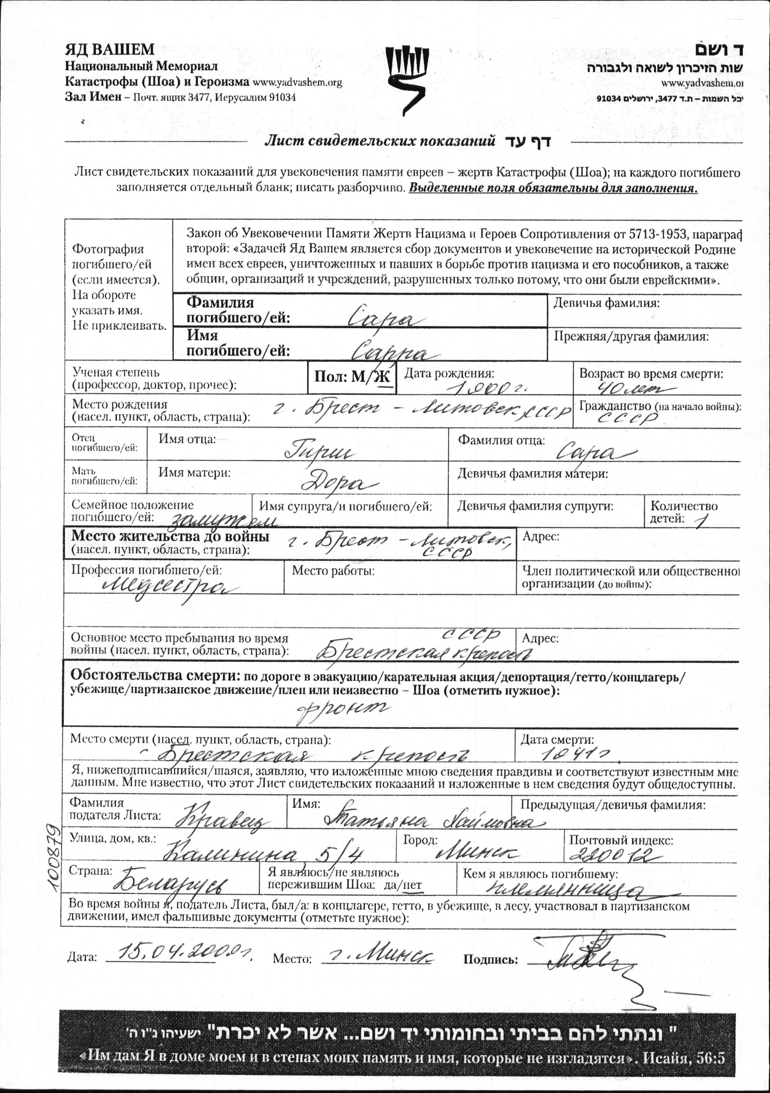 Yad Vashem - Pages of Testimony Names Memorial Collection