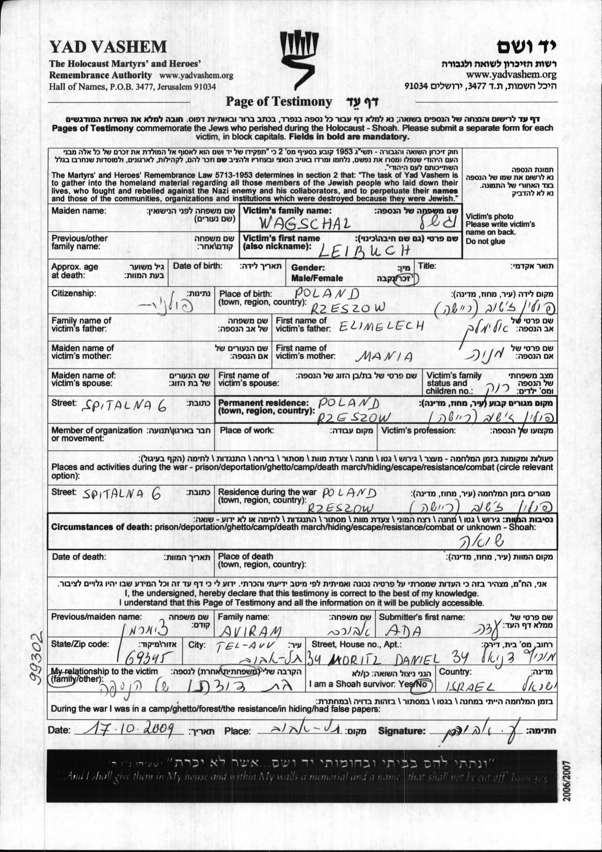 Wagschal Leibuch Rzeszow, Pologne Feuille de témoignage
