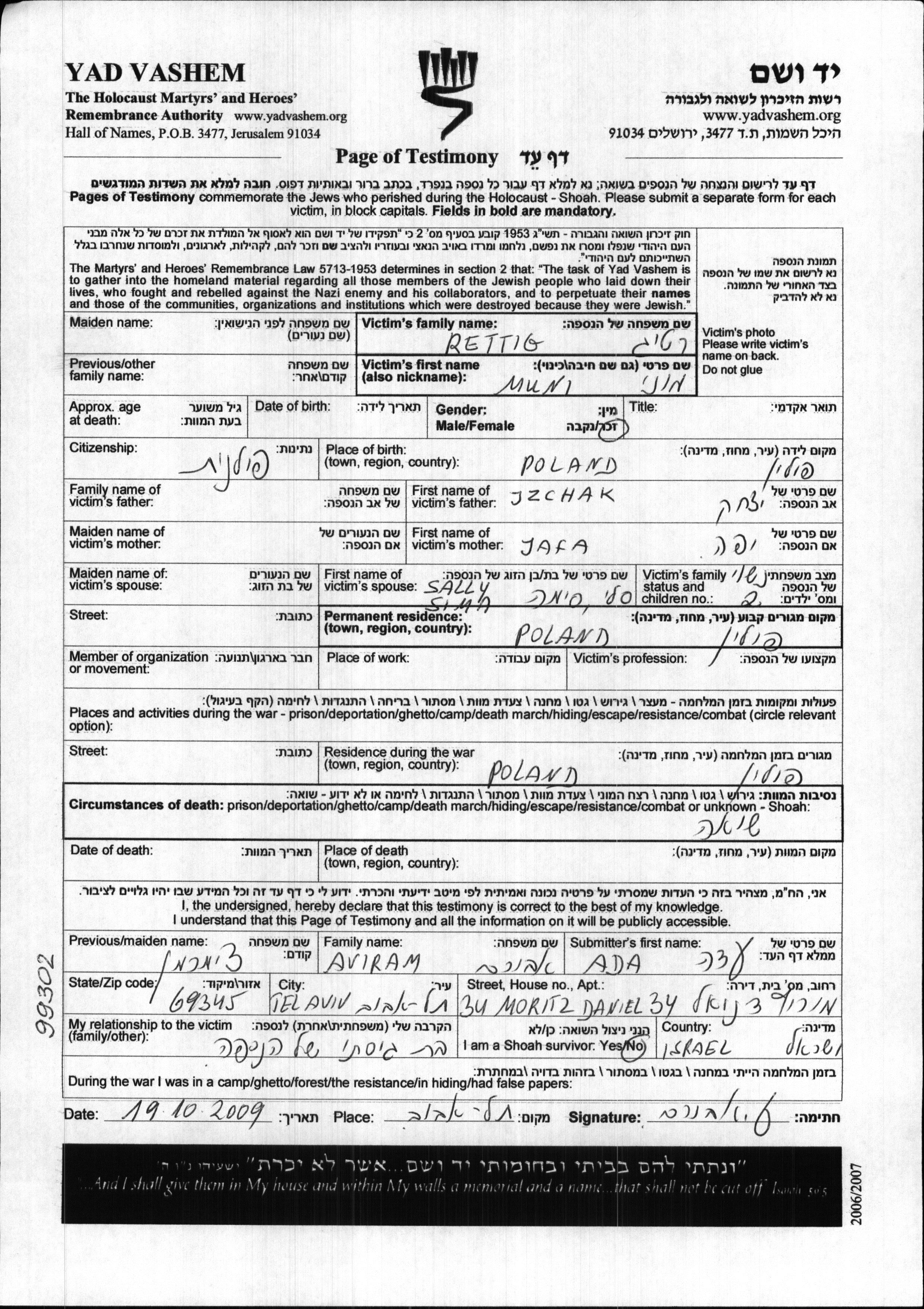 Yad Vashem - Pages of Testimony Names Memorial Collection