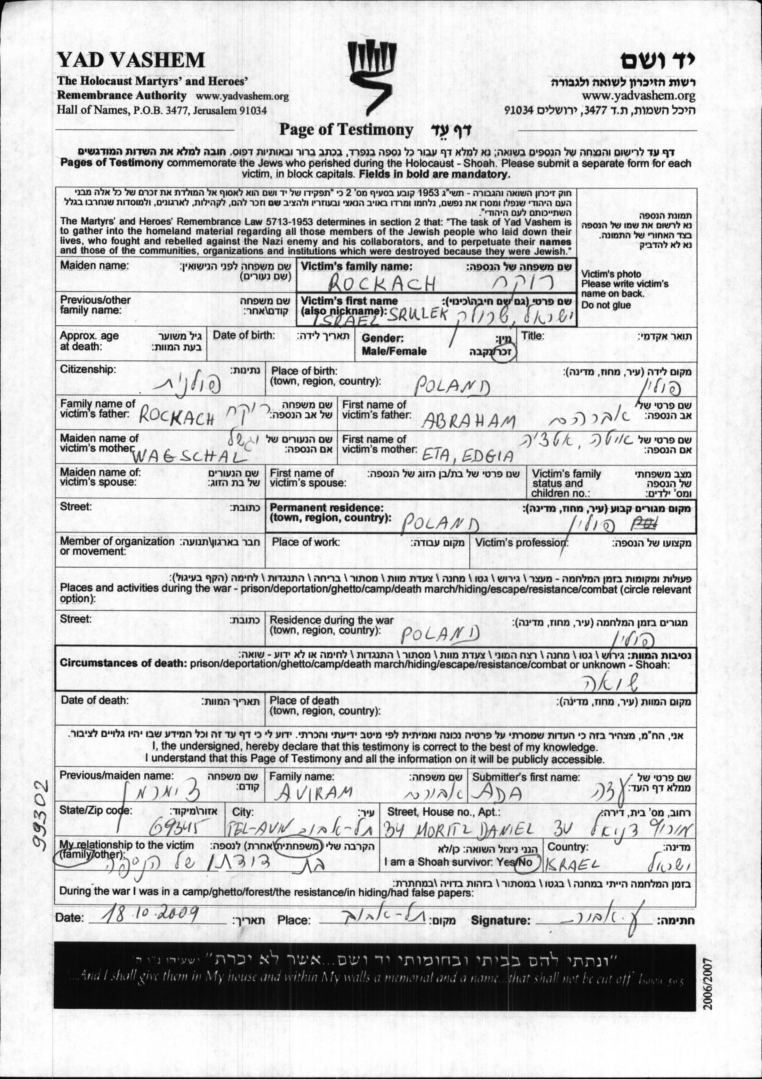 Rokakh Israel Pologne Feuille de témoignage