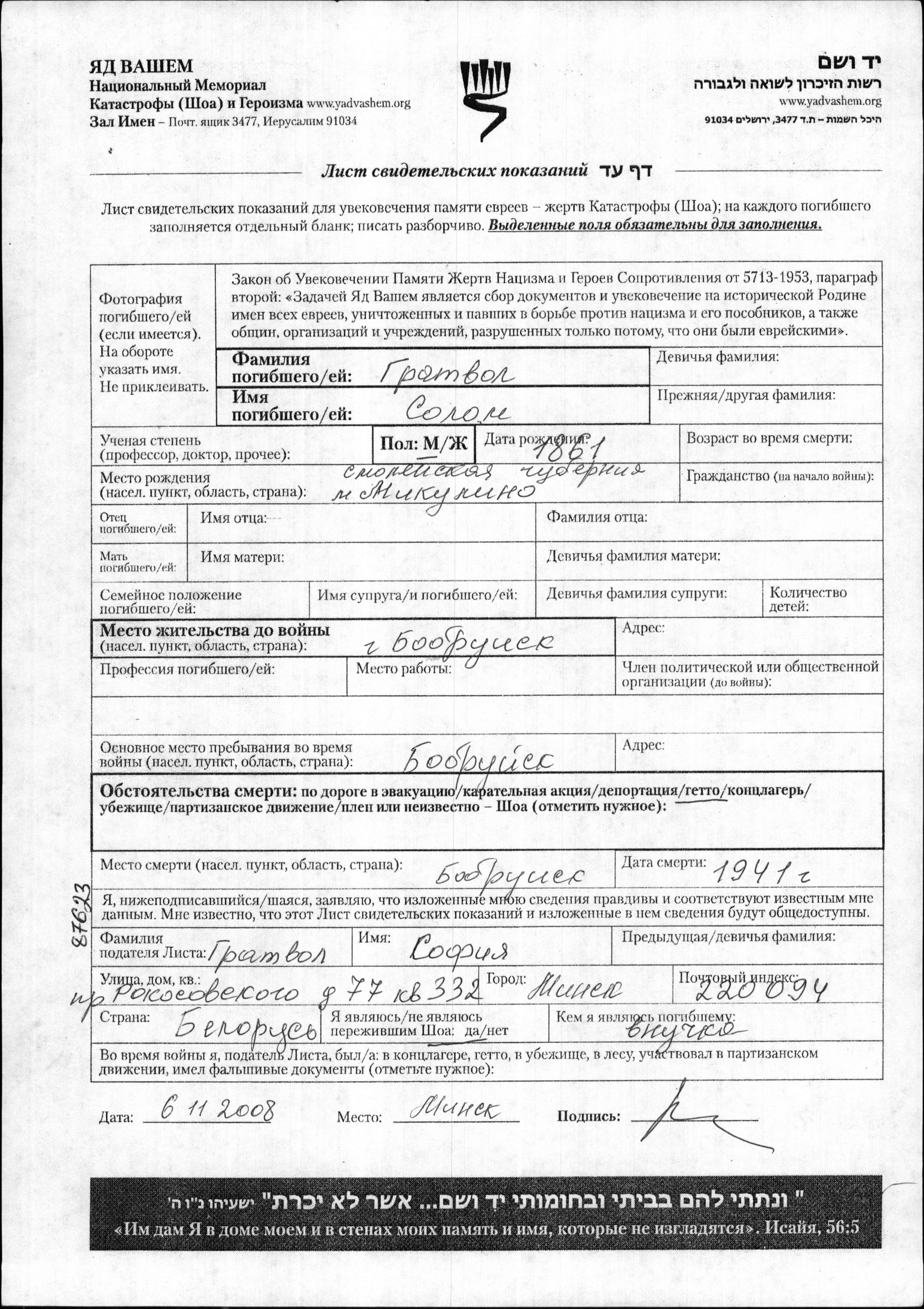 Solon Gratvol est né à Mikulino, Russie (URSS) en 1861. Avant la seconde guerre mondiale il vivait à Bobruysk, Bélorussie (URSS). Au cours de la guerre, il était à Bobruysk, Bélorussie (URSS).