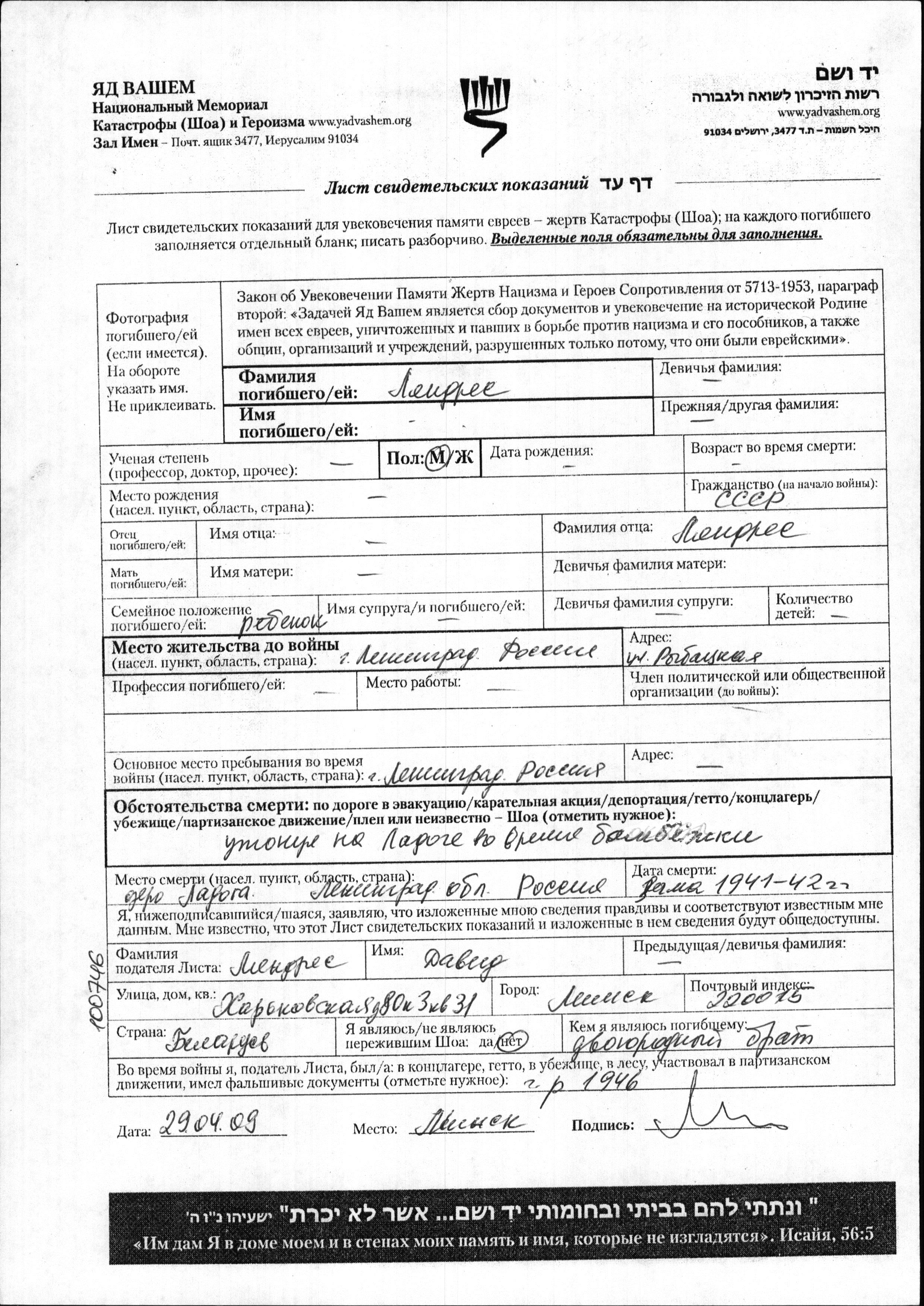 Il a été assassiné pendant la Shoah. Lieu de la mort: Ladozhskoye Ozero (Leningrad Area), Russie (URSS) en 12/1941.