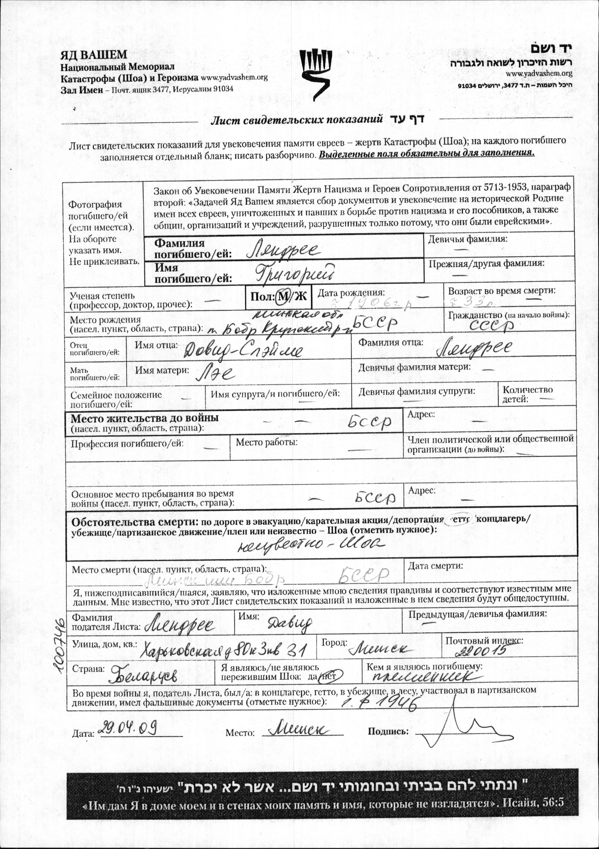 Grigoriy a été assassiné pendant la Shoah. Lieu de la mort: Bélorussie (URSS).