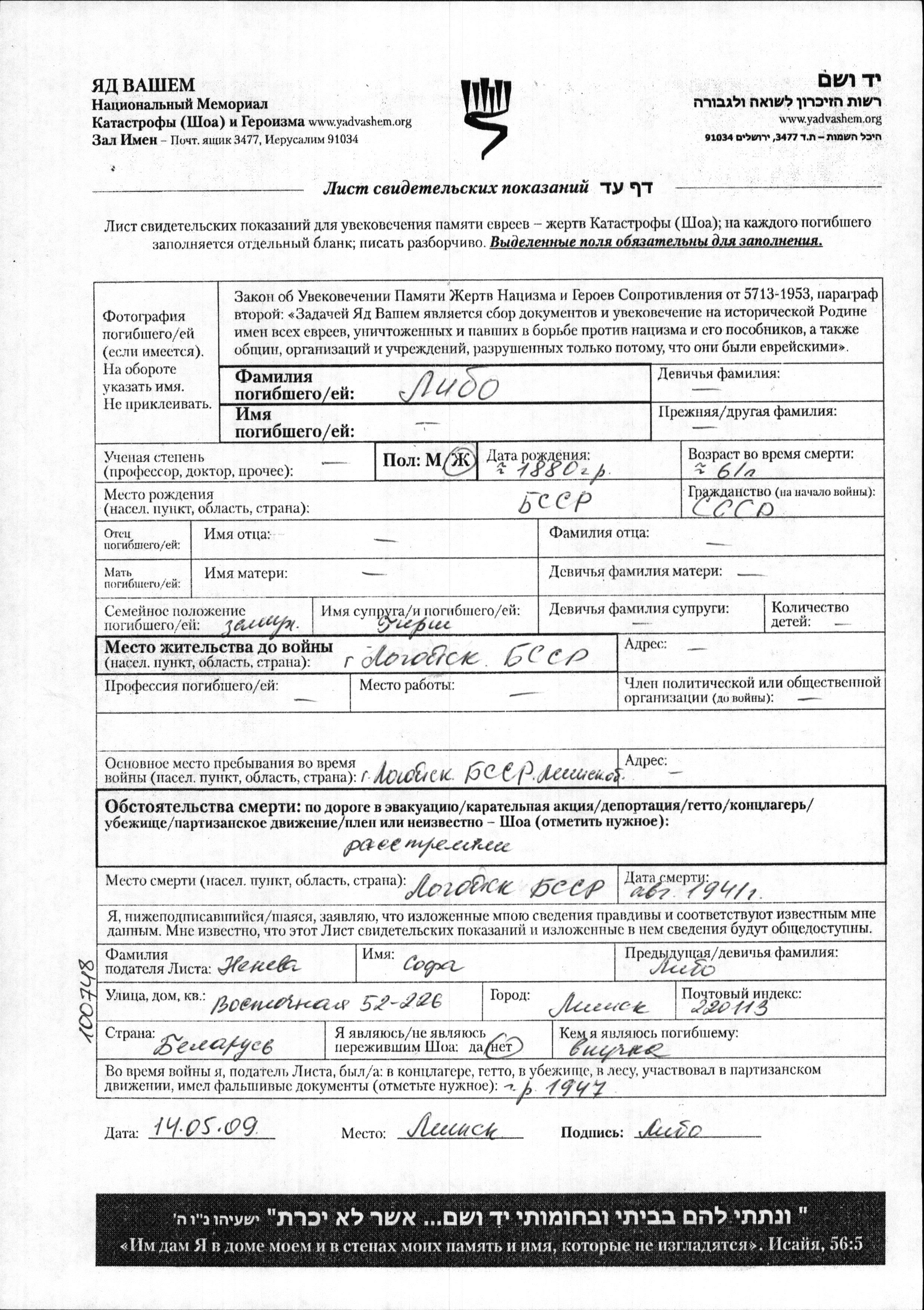 prénom inconnu Libo est née à Bélorussie (URSS) en 1880. Elle était Mariée à Girsh. Avant la seconde guerre mondiale elle vivait à Logoisk, Bélorussie (URSS). Pendant la guerre, elle était à Logoisk, Bélorussie (URSS).