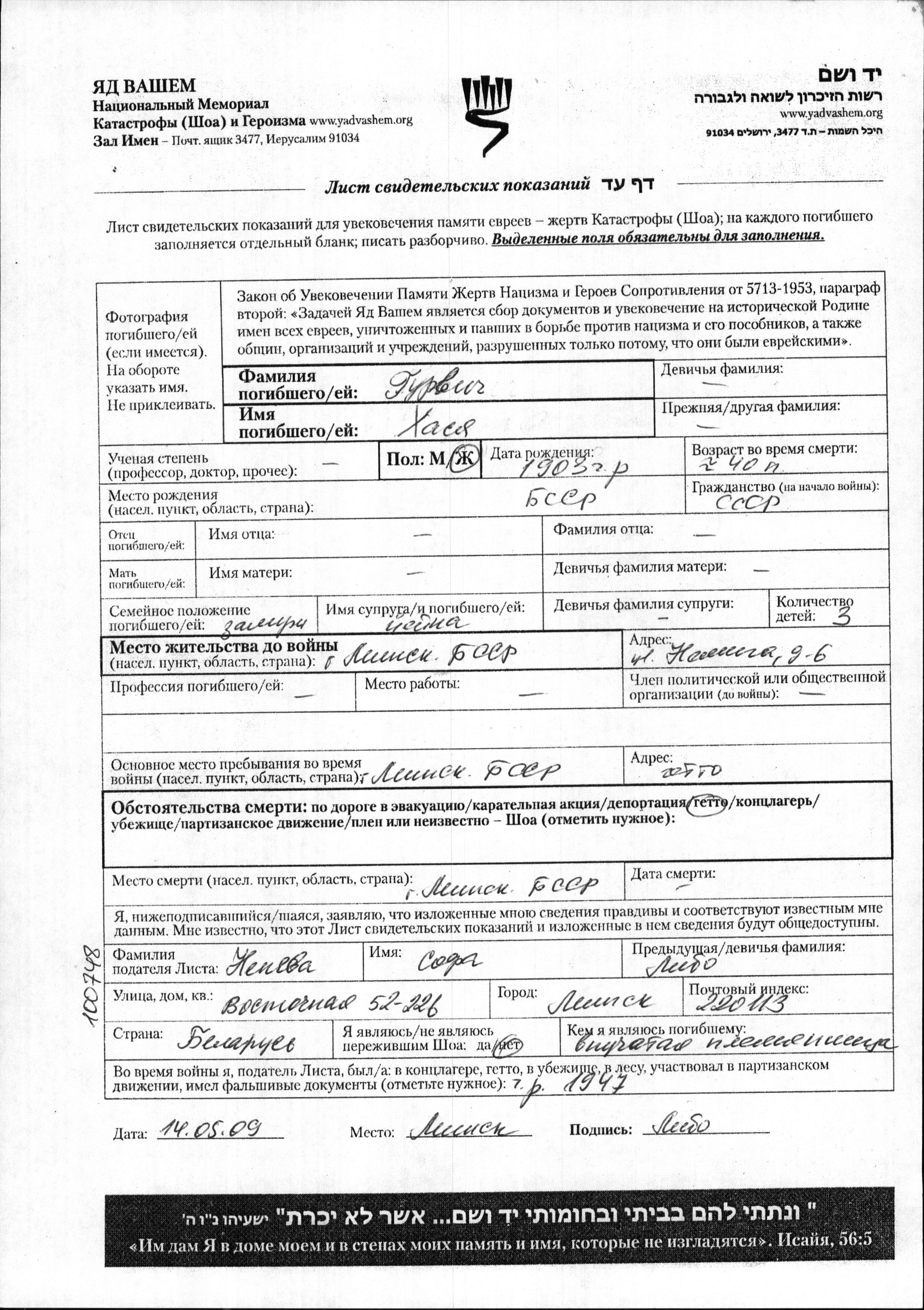 Gurvich Khasya 1903 Minsk, Bélorussie (URSS) Feuille de témoignage