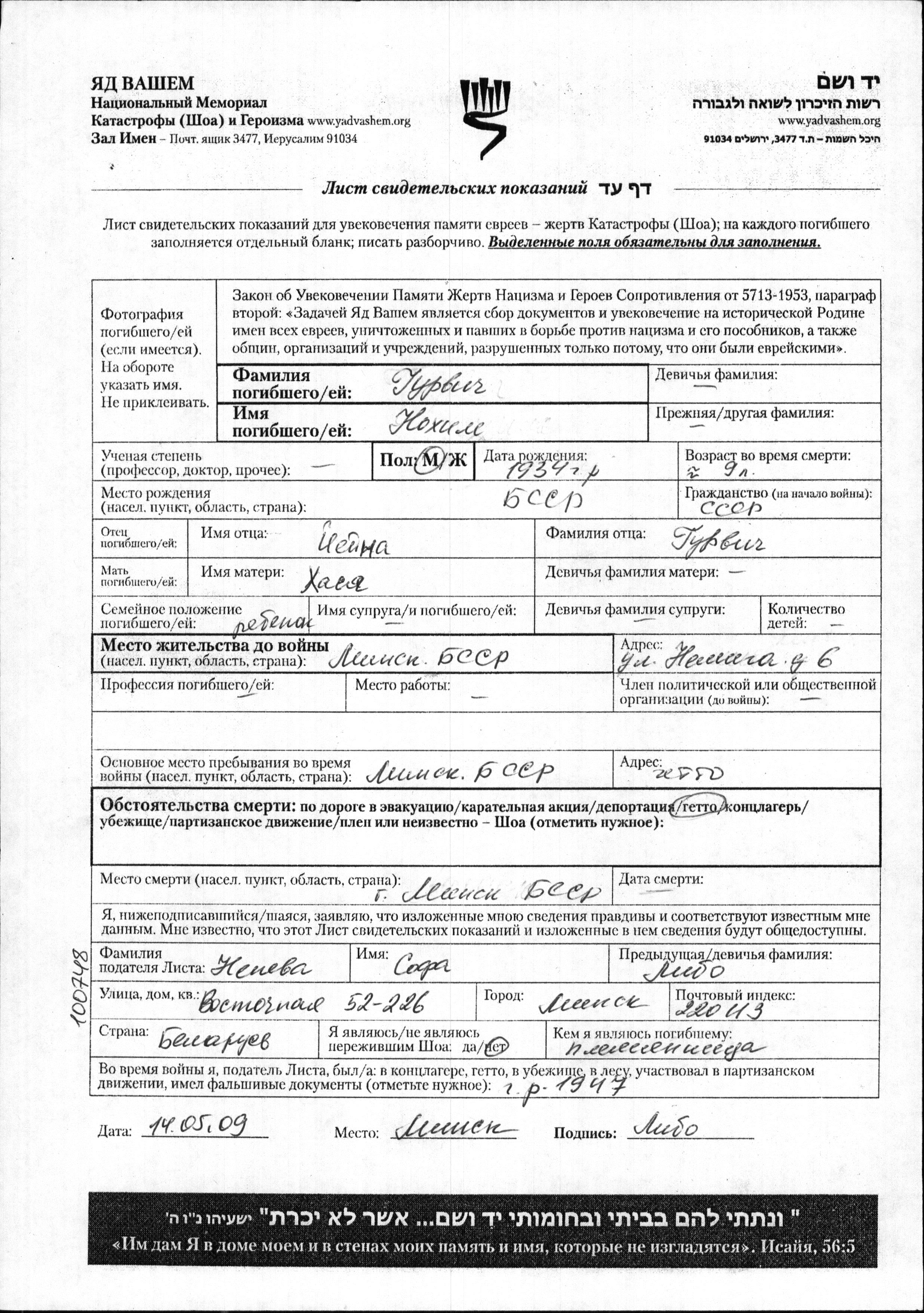 Gurvich Nokhim 1934 Minsk, Bélorussie (URSS) Feuille de témoignage