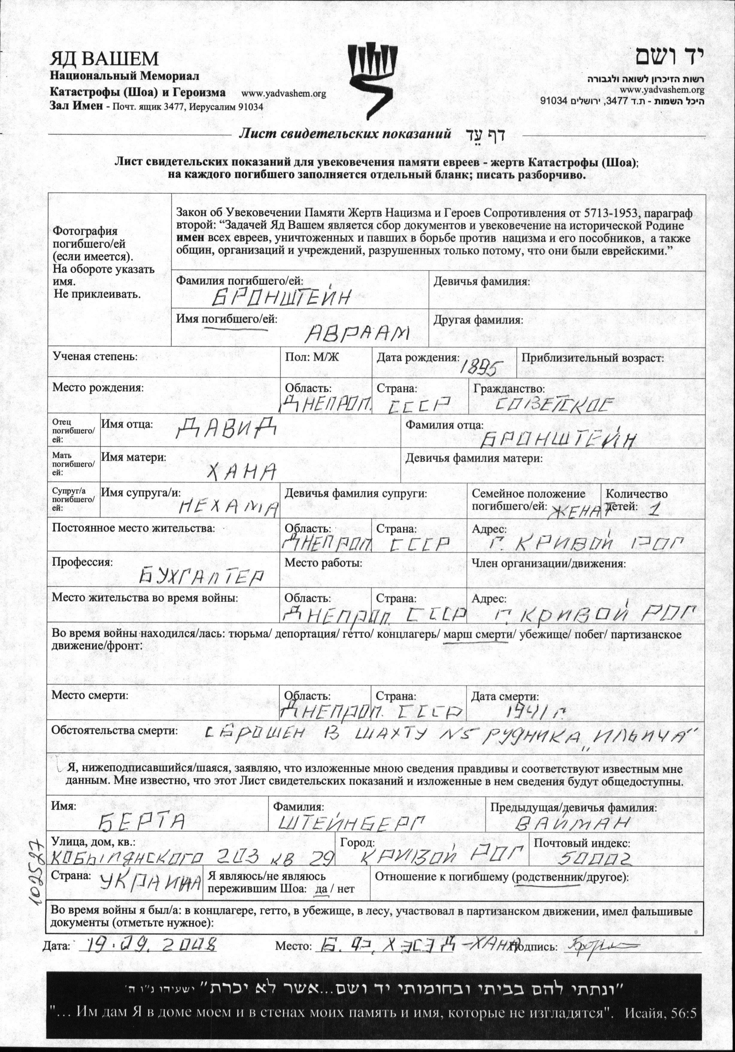 Bronshtein Avraam 1895 Krivoy Rog, Ukraine (URSS) Feuille de témoignage