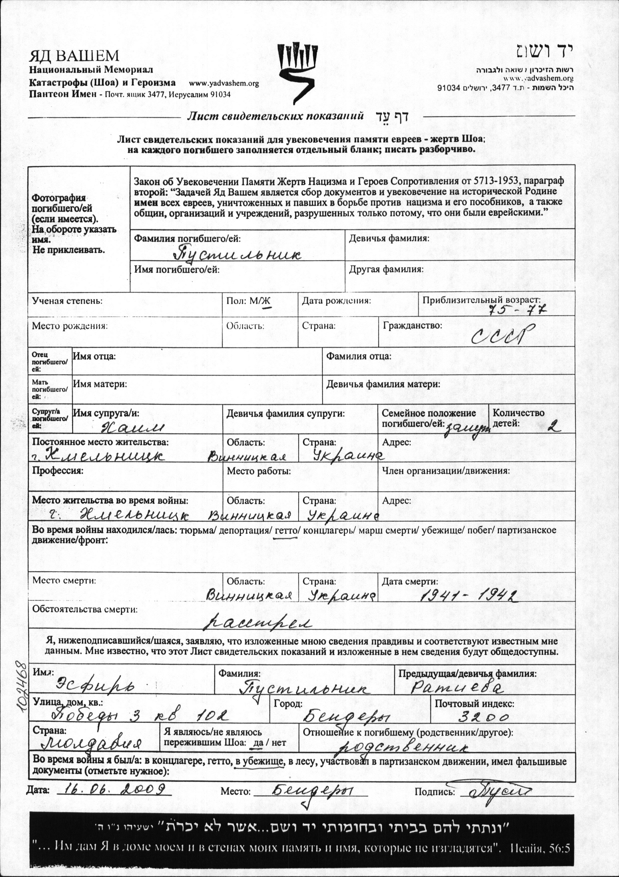 Pustilnik prénom inconnu Khmelnik, Ukraine (URSS) Feuille de témoignage