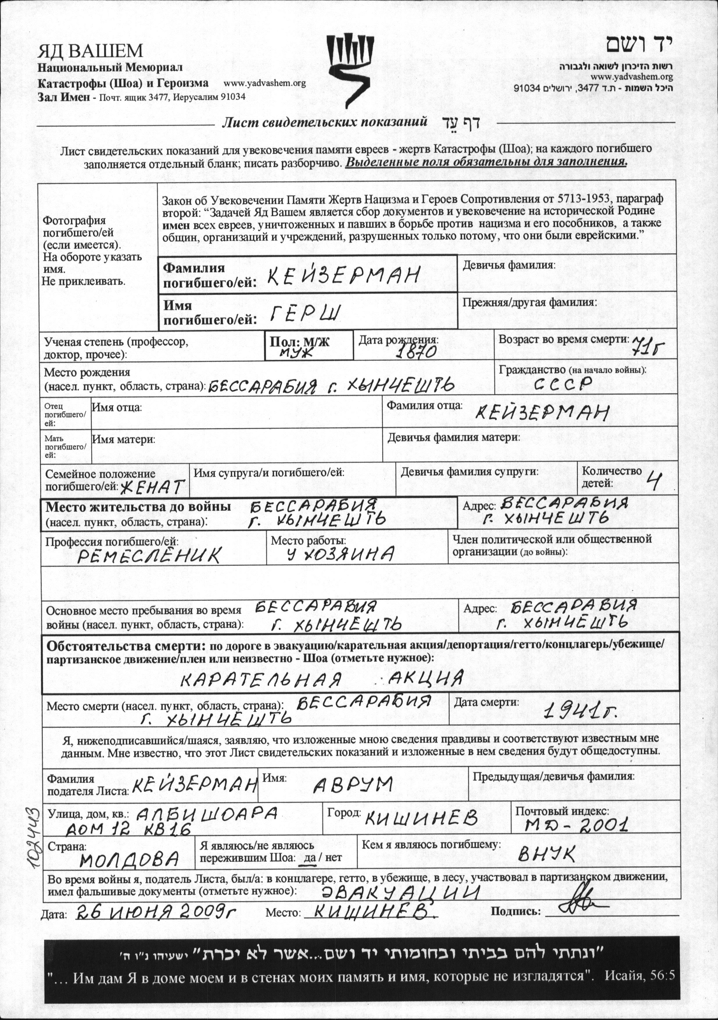 Gersh a été assassiné pendant la Shoah. Lieu de la mort: Hancesti, Roumanie en 1941.