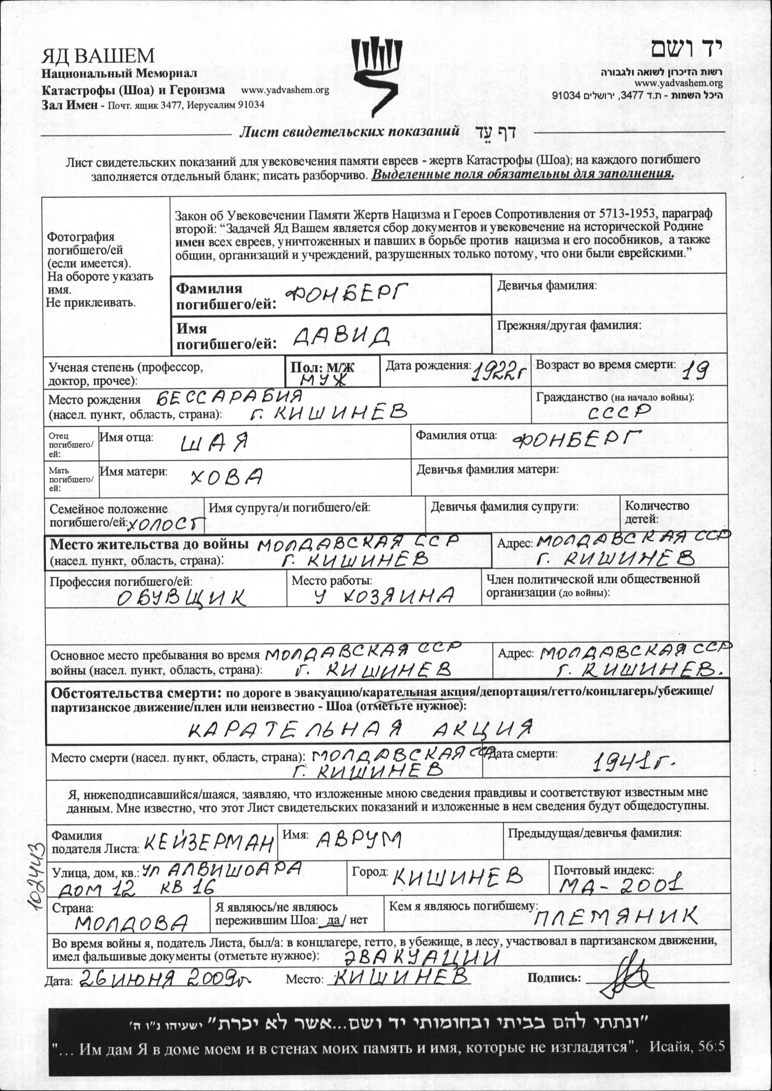 Fonberg David 1922 Kisinev, Roumanie Feuille de témoignage