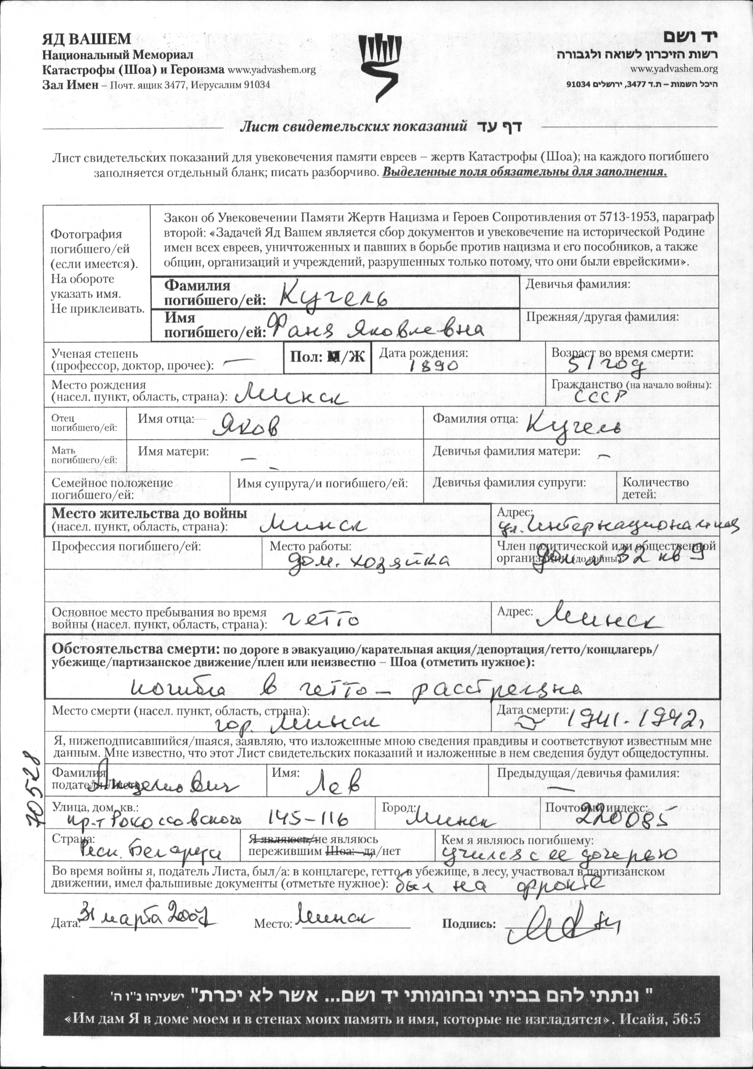 Kugel Fanya 1890 Minsk, Bélorussie (URSS) Feuille de témoignage