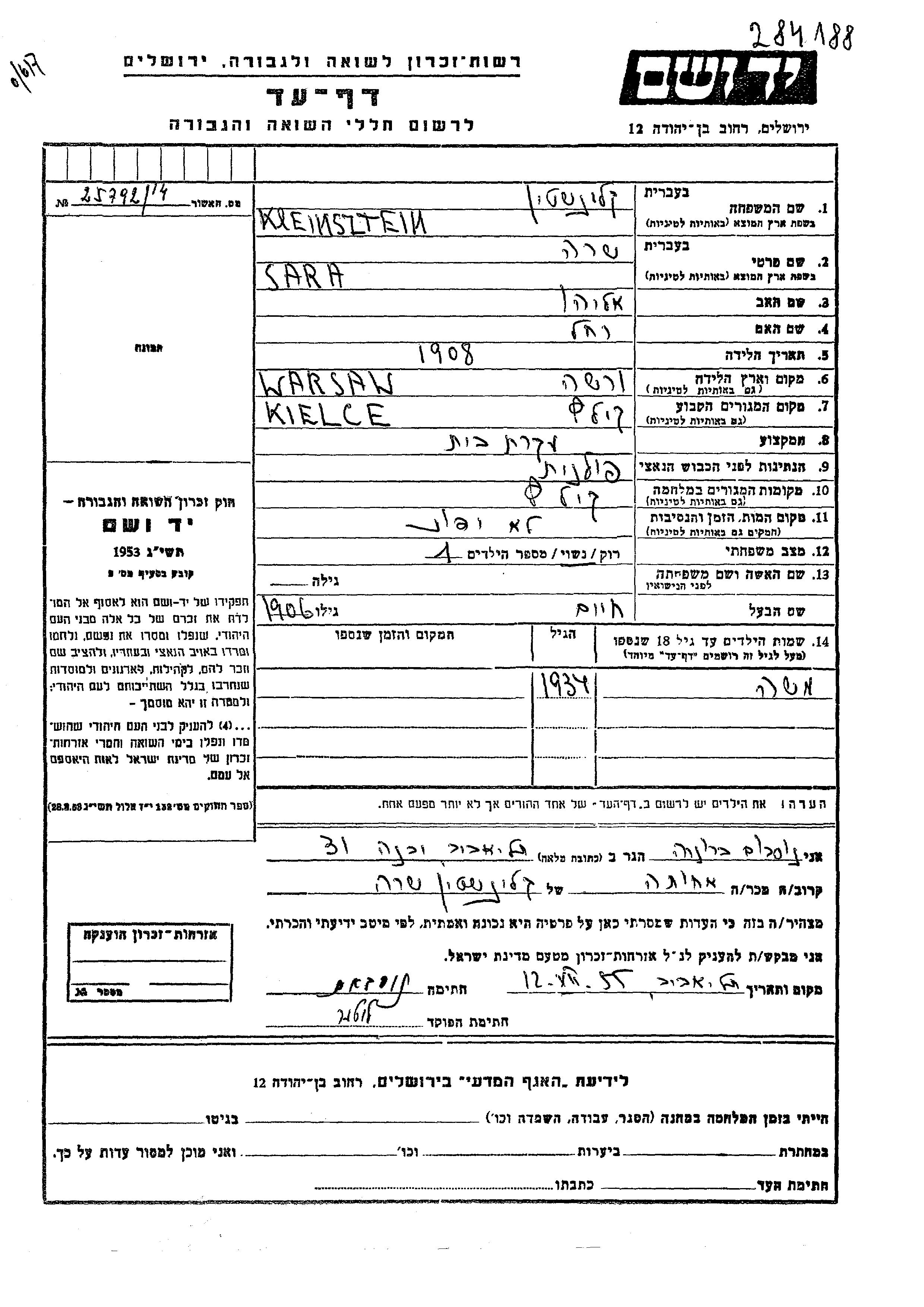 Kleinsztein Sara 1908 Kielce, Pologne Feuille de témoignage