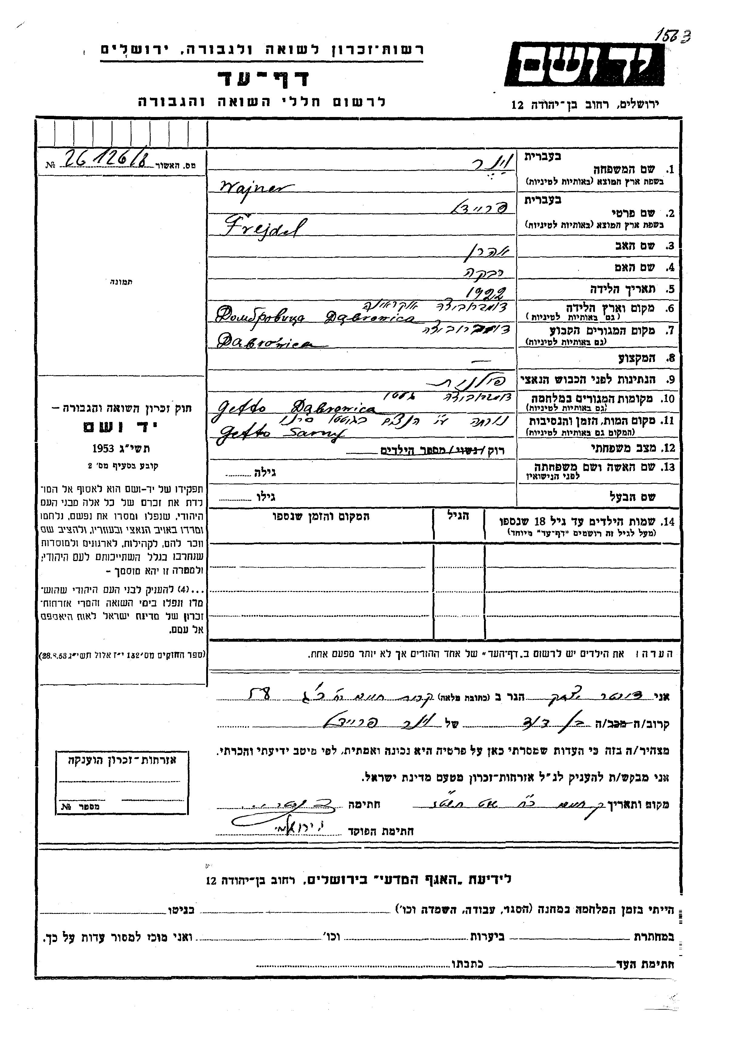 Wajner Viner Frejdel 1922 Dabrowice, Pologne Feuille de témoignage