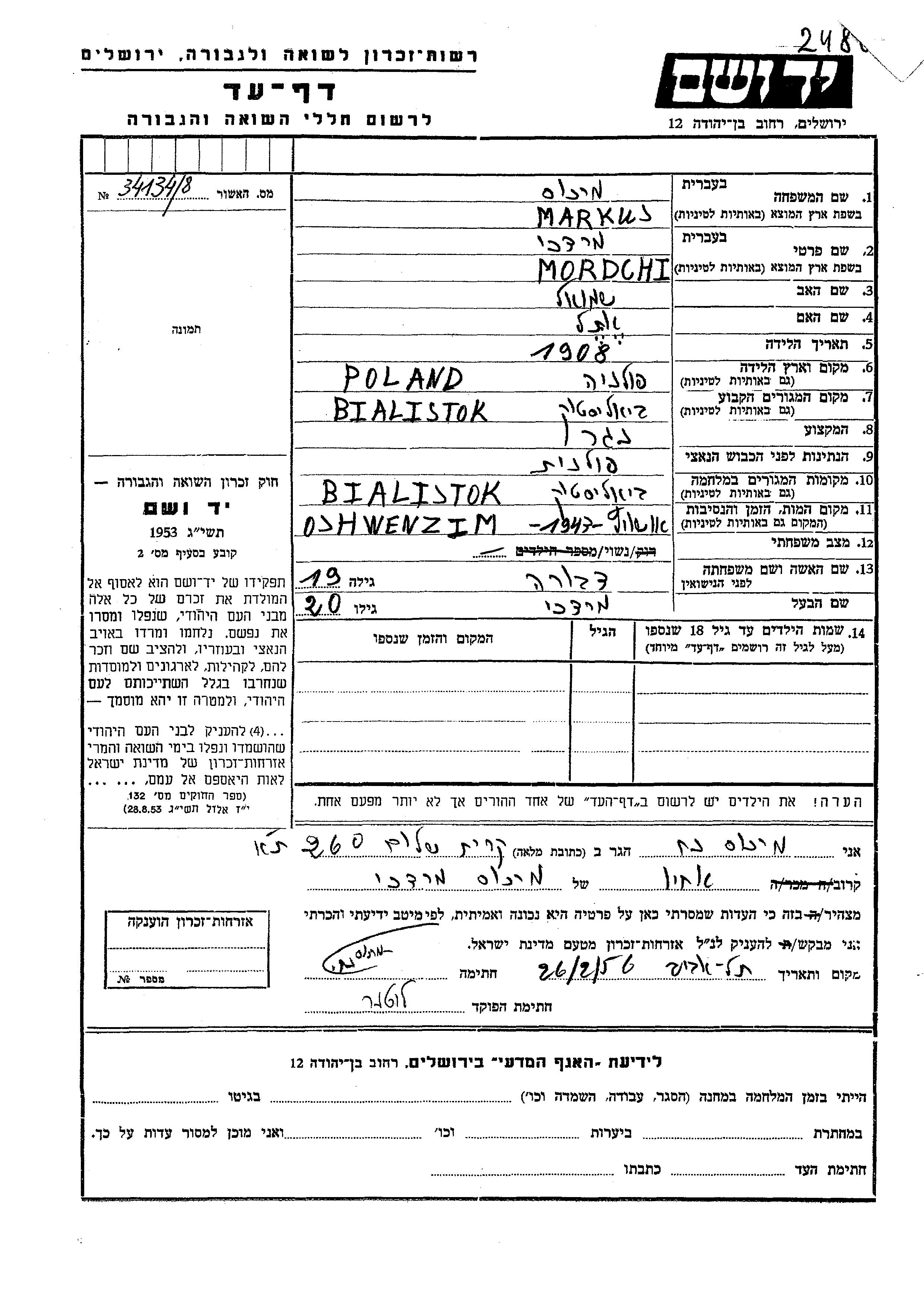 Markus Mordchi 1908 Bialistok, Pologne Feuille de témoignage