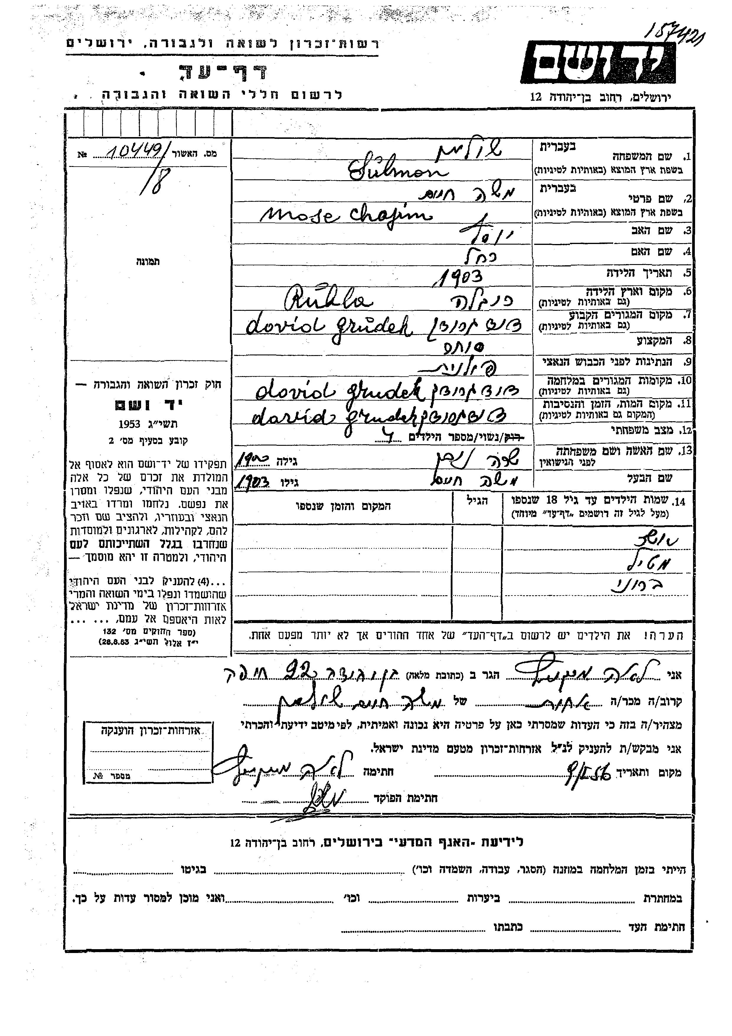 Sulman Breina Dawidgrodek, Pologne Feuille de témoignage